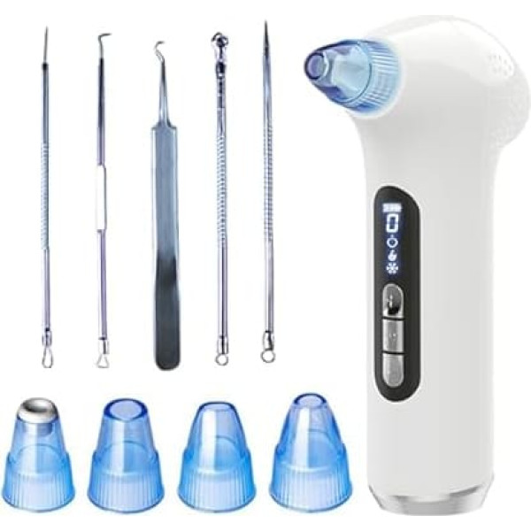 Pore vacuum: Apply to all skin types: Our pore cleanser face sucker has 5 different suction levels and 5 suction heads for a variety of skin types and skin conditions. Generally, level 1 is ideal for sensitive skin, level 2-3 for dry and neutral skin and level 4-5 for combination skin and oily skin. 3 modes, comprehensive care: Before using the suction mode, it is recommended to use the hot compress mode to open the pores. It can help suck out the blackhead more easily. After deep cleaning, use a cold compress that can help reduce pores and prevent dust from entering again. The positive and negative ion massage helps to clean pores, improve cell vitality, improve blood circulation and metabolism of the skin, as well as accelerate the removal of essences. 【Set of traditional blackhead removal tools】The set of traditional skin care tools includes everything you need to manually remove stubborn blackheads or pimples. These tools perfectly complement the pore aspirator and allow for even more thorough skin cleansing. Improved blackhead remover pore cleaner kit: the pore vacuum blackhead remover kit combines effective vacuum extraction and a hot-cold compress mode to provide a comprehensive skin cleaning solution for effortless removal of blackheads and blackheads. With consistent use for more than 4 weeks, visible results have been achieved, with regular use, skin dirt is completely eliminated. Safe and painless and effective: Blackhead remover vacuum uses innovative vacuum technology, the pore vacuum extraction is twice as high as ordinary products. The blackhead remover tools are made of environmentally friendly ABS material, non-toxic, non-irritating and can be used safely on the face. and are more effective than conventional facial cleansing methods. The blackhead remover is equipped with a 900 mAh battery. After fully charged, you can also take it anywhere when travelling. › See more product details; Product description Package contents: Set of traditional tools for targeted blackhead removal; Product description Package contents: Set of traditional tools for targeted blackhead removal; Package contents: Set of traditional tools for targeted blackhead removal