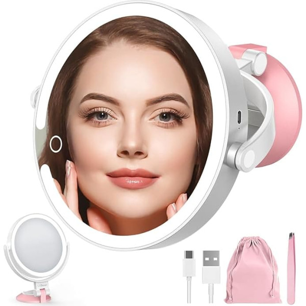 POWERFUL LIGHT BRIGHTNESS & 3 COLOR LIGHT MODES Equipped with 64 high bright LED bulbs, LitBear lighted makeup mirror with suction cup provides 3 color light modes (natural light, warm light, cool light). Coupled with stepless brightness adjustment, which provides you a great help for your makeup, giving you a great view when applying makeup in dark or poorly lit areas, see every detail anytime, anywhere. Bright light without glare, can protect your eyes 10x magnification / 1x HD double-sided mirror: This is a 10x and 1x travel mirror with light and high-definition mirror surface. 1 x illuminated mirror is suitable for general makeup and daily skin care. The 10x magnification mirror with light can display more details for makeup, such as applying mascara, lipstick, blackheads/blemishes, eyeliner drawing to ensure no more embarrassment or small imperfections. NOTE If you use 10x magnification mirror, please keep 4 inches or even closer to your face Improved strong suction cup wall makeup mirror: The unique strong suction base can firmly stick to mirrors, tiled walls or glass surfaces, providing a stable and flexible using experience without worrying about slipping. With 360 degree rotation and double-sided design, the magnifying mirror suction cup can be conveniently adjusted to any angle. You can also use this lighted magnifying makeup mirror as a tabletop or bathroom mirror Dimmable lighting and smart function: the illuminated make-up mirror with magnification has a highly sensitive touch control. Long press to adjust the brightness between 10% and 100% and touch to change the light colour. It has a brightness memory function and a 30-minute auto-off timer, which is convenient for everyday use Long lasting battery, perfect travel mirror companion: With a built-in efficient 1500 mAh battery, a single charge is enough for make-up application and touch-up for commuters and 2-3 days business trips, over 3 hours of continuous use. Comes with a storage bag and pink tweezers and its lightweight and portable design makes it an indispensable beauty assistant for your travel companion IDEAL FOR WOMEN AND GIRLS Express your love and care with this 10x/1x double sided illuminated magnifying mirror with suction cup. The travel magnifying mirror can be an ideal gift for mother, girlfriend, wife, etc. Valentine's Day, Mother's Day, Christmas, New Year and other special festivals › See more product details; Product description Product description LitBear 2025 Upgraded Magnifying Mirror with Light 10X/1X Double Sided Travel Makeup Mirror with Suction Cup and Tweezers 3 Colors Dimmable Rechargeable Illuminated Magnifying Mirror with 360 Degree Rotation Safety Warning Use the 10x magnification side carefully, keep the mirror close to your face to avoid eye strain. Handle the mirror carefully to avoid possible breakage or damage as the frame is made of ABS.; Product description Product description LitBear 2025 Upgraded Magnifying Mirror with Light 10X/1X Double Sided Travel Makeup Mirror with Suction Cup and Tweezers 3 Colors Dimmable Rechargeable Illuminated Magnifying Mirror with 360 Degree Rotation Safety Warning Use the 10x magnification side carefully, keep the mirror close to your face to avoid eye strain. Handle the mirror carefully to avoid possible breakage or damage as the frame is made of ABS.; Product description LitBear 2025 Upgraded Magnifying Mirror with Light 10X/1X Double Sided Travel Makeup Mirror with Suction Cup and Tweezers 3 Colors Dimmable Rechargeable Illuminated Magnifying Mirror with 360 Degree Rotation Safety Warning Use the 10x magnification side carefully, keep the mirror close to your face to avoid eye strain. Handle the mirror carefully to avoid possible breakage or damage as the frame is made of ABS.