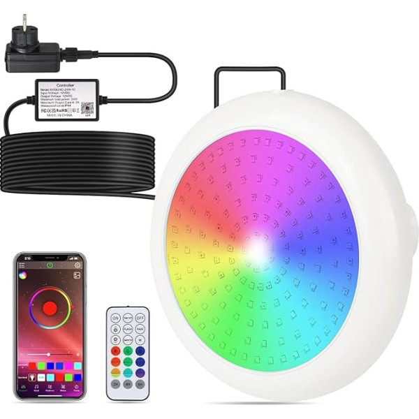 【Easy Installation】High quality, super strong, sealed magnet, no wiring required. It is magnetic and sticks directly to the steel wall of the pool for easy removal and cleaning of the pool. Alternatively, you can also use the included triangular metal base to attach it anywhere. No tools, no drilling, easy installation in minutes. Ideal for steel wall pools, inflatable pools and fountains. Intelligent app and remote control: Scan the QR code on the packaging box or controller to download the application, connect the pool lights to your phone and you can use it. The comfortable user interface allows you to control over 16 million colours, synchronise with the rhythm of music or sound, use dimming to set the atmosphere or choose your preferred colour effects. IP68 waterproof swimming pool light: using high-quality ABS + PC materials, completely filled with epoxy resin inside, it has high tear resistance, heat resistance and IP68 waterproof rating. 144 bright LED beads are used to project a wide beam of light and illuminate the important areas of the entire pool with amazing brightness. 12 V safe voltage: the low voltage system ensures safe swimming at night. By using a transformer, the voltage can be reduced from AC 230 volts to DC 12 volts, ensuring safe underwater use and unlimited colour effects. The cable length is 7 metres and meets your lighting needs. Timer function: with our 24 W RGBW LED pool lighting, you can set working hours. Once set, even if the phone is out of range, the light will automatically turn on and off at certain times every day. There are also 20 preset modes and 8 light scenes to choose from. › See more product details
