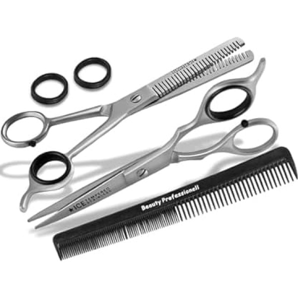 Premium hairdressing scissors set - 3 pieces consisting of a hair scissors, a thinning scissors and a hair comb Hair scissors features: with micro-serration, which makes the hair less slipping when cutting Complete set – for daily professional hair care at home Material hair comb – the 2-piece hair comb is made of high-quality plastic Premium quality – all components in this hair scissors set have been processed and manufactured by specially trained specialists › See more product details