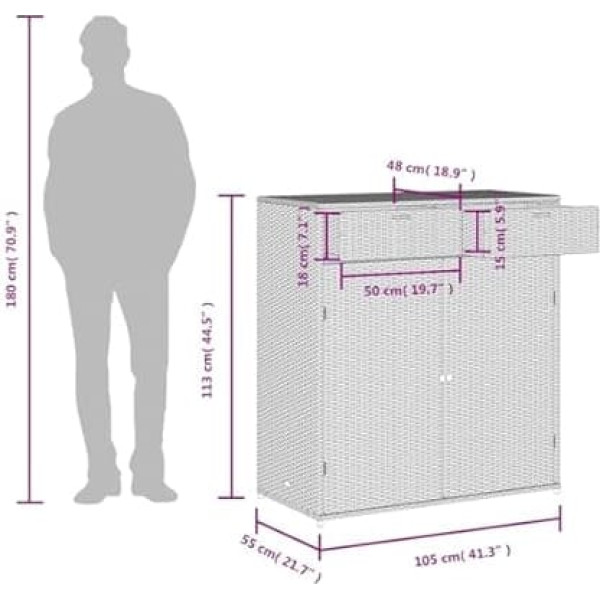 This outdoor cabinet is perfect for keeping your blankets, cushions, garden supplies, pool towels and other items neatly and easily accessible. Durable material: PE rattan, also known as poly rattan, is a robust, easy-care synthetic material that has the look of natural rattan. It is characterised by a low weight and is easy to clean. Due to its durability and weather resistance, it is often used in the production of garden furniture. Plenty of storage space: This outdoor storage cabinet offers plenty of space to store your garden tools, pool toys, outdoor cushions and more. Robust and stable frame: thanks to the powder-coated steel frame, the outdoor furniture is robust, stable and suitable for everyday outdoor use. Practical doors: Both 2 doors are equipped with stainless steel door knobs and magnets for easy opening and closing. Attention: › See more product details