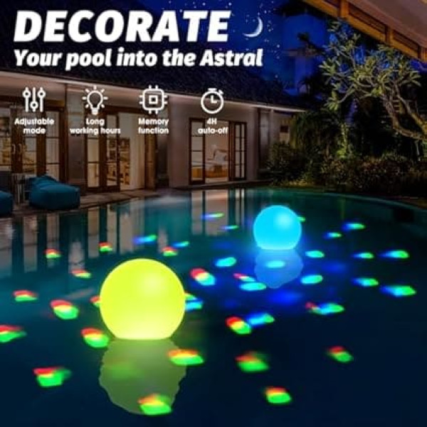 Floating Pool Lighting - This pool light consists of a spherical light on the top and a spectacular underwater lighting system. With 16 million bright colours and a choice of 10 modes, it creates stunning underwater light shows. Whether on a quiet evening or at a boisterous pool party – thanks to its diverse light combinations, it spreads fascinating colour games and immerses the entire pool in a magical atmosphere. High-quality materials - This bath light is made of high-quality PP material. Even with long-term use, no problems such as cracks or deformation occur and it can always maintain a good external appearance and structural integrity. It is not necessary to replace it frequently due to the lack of material durability. It is a really suitable for long-term use and trustworthy helper when lighting swimming pools. Rechargeable design - This hot tub lighting is rechargeable, so it can be operated continuously in pools, spas or hot tubs. With just one charge, it can be used for several pool nights. There is no need to replace the batteries frequently, which is both hassle-free and environmentally friendly. So you can enjoy carefree happy moments with your family while immersing yourself in this warm light atmosphere. IP68 waterproof – DeeprBlu pool lights are equipped with an integrated waterproof rating and have an IP68 waterproof. Therefore, you can safely use it under water. Its excellent waterproofing not only allows it to stably exercise a lighting and decoration function in all types of water scenes, but also extends the life of the underwater light show, making it an ideal lighting partner for all types of water scenes. Versatile use in different scenarios – it is not only suitable for pools, but can also be used as swimming lights for hot tubs and spas. Whether it's a large pool party or a peaceful moment of relaxation in a private bath, this spa light fits perfectly. Its elegant swimming design allows you to swim freely on the water surface, adapts to the water and adds a touch of vibrancy and romance to different water scenes. › See more product details