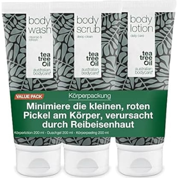 Softens and smooths rough, uneven skin - Our exfoliating body scrub helps remove dead skin cells and smooth rough areas to make your skin feel silky and smooth Soothes irritated and inflamed skin - Tea tree oil is a natural anti-inflammatory agent and therefore the perfect ingredient for our body wash to soothe irritated skin caused by keratosis pilaris or dryness Moisturises dry skin - Our nourishing body lotion provides long-lasting moisture to keep your skin looking healthy and nourished and prevent dryness and flakiness Natural and safe for all skin types - We only use natural ingredients in our formula, making them safe for all skin types, including sensitive skin. Our Tea Tree Oil Smooth Skin Kit offers a complete solution for anyone who wants to improve the appearance and texture of their skin