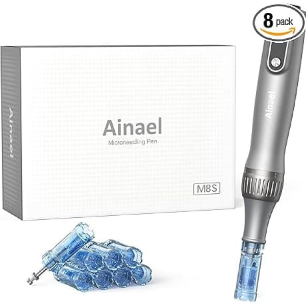 ORIGINAL AUTHENTIC M8S: The Ainael M8S Microneedling Pen is an improved version of the Ainael M8, a professional wireless micro needle machine that effectively responds to a variety of skin care needs, from fine lines to deeper treatments that dramatically improve the texture and appearance of the skin. Each M8S and its cartridges come directly from the Ainael factory and ensure 100% authenticity. Powerful function and wide application: this electric microneedle is more powerful than manual microneedle. Ainael M8S has high frequency technology (7000-15000rpm/min) to reduce pain during needle puncture, quickly cover large skin areas, improve treatment efficiency. It is suitable for a variety of areas such as face, scalp, neck, hands, meets different skin types and individual treatment needs. Precise control and higher safety: equipped with 6 adjustable speeds and 0 ~ 2.5 mm adjustable needle length, digital screen shows the intensity level; easy and effortless operation, one button to start and adjust the depth and speed of the needle to ensure the uniformity and effectiveness of the treatment, reduce skin trauma and recovery time. The anti-reflux function reduces the risk of infection. Multiple needle configurations: the M8S microneedling pen comes with 8 cartridges, including 2 x 18-pin, 2 x 36-pin, 2 x 42-pin, and 2 x Nano-R. Each needle is individually sealed in sterile packaging, ensuring safety. The wavy treatment surface of the head improves serum absorption, promotes collagen and elastin production, stimulates cell regeneration and promotes hair and beard growth. Portable and economical: with a built-in 380 mAh high capacity battery and Type-C charging support, the integrated packaging lock box is easy to carry. The wireless design allows you to enjoy professional skincare and treatments at home or on the go, reducing the time and cost of frequent visits to beauty clinics. It is an ideal choice for skin care enthusiasts or as a gift for friends and family, especially for women. › See more product details