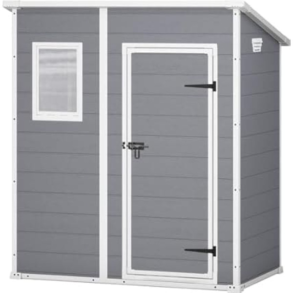 Space miracle: room capacity approx. 3.2 m³, small dimensions (exterior: W x D x H: 183.5 x 111 x 200.5 cm), designed to fit the area between your property and the fence Easy care: practically no maintenance required – no peeling, weathering or fading, as it is made from UV and weather-resistant, high-quality polypropylene (plastic) Thoughtful: fixed window provides daylight inside, and the integrated ventilation ensures even air circulation. Sufficient room height allows you to walk around the interior. Quick to use: easy to install with standard tools Dry and safe: the base plate protects stored items from mud, dirt and rainwater. Lockable - for added security (lock not included) › See more product details