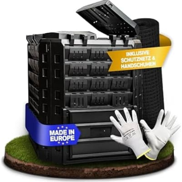 Premium composter: Our Komposterheld garden composter (dimensions 80 x 70 x 70 cm) and 320 L capacity is your ideal helper for thermal composting and odour insulation in your garden. Includes Floor grid and gloves: Our garden composter comes in an all-in-one package with garden gloves and floor grid. This gives you protection against unwanted animals. Weather-proof: the garden composter is made of high-quality, weatherproof plastic that can withstand weather influences and can stand in the garden all year round. Optimal size: thanks to the compact size, the composter can be used flexibly. It provides a sufficient capacity for composting without taking up much space. Easy and quick assembly: Our thermal composter is designed to be assembled in a few simple steps with a simple plug-in system. › See more product details; Product description Garden composter - your perfect partner for sustainable gardening. Discover the garden composter With compact dimensions of 80 x 70 x 70 cm, a weight of 5 kg and a generous capacity of 320 litres, this composter is the ideal helper for effective thermal composting in your garden. Make your garden environmentally friendly and sustainable with our high-quality 320L garden composter. This complete package provides you with everything you need for efficient and straightforward composting. [Package Contents] / All-in-One Package In addition to the generous 320L garden composter, you will receive a protective net/floor grid that effectively keeps unwanted animals away - [rat safe] In addition, robust garden gloves are included that allow you to work with the compost hygienically and comfortably. With this practical complete package, using your composter is child's play. Quick and easy to install. The garden composter is equipped with a clever plug-in system that allows quick and easy assembly. The clear instructions guide you step by step through the assembly, so you can put your new thermal composter into operation in no time. [Optimal and efficient composting] Thanks to the sophisticated ventilation system and the special construction, the composter creates ideal conditions for the decomposition of organic waste. Kitchen and garden waste is quickly and effectively converted into nutrient-rich compost that enriches your soil. The thermal composting dampens the formation of odours and accelerates the composting process - for an optimal result! Versatile application and space-saving design: With its compact and thoughtful design, the composter can be used flexibly in different garden areas. The perfect size ensures that you have enough volume for efficient composting without taking up much space in your garden. High-quality material: Our KOMPOSTIERHELD garden composter is made from high-quality, weatherproof plastic that can withstand even the harshest weather conditions. So it can safely stand in the garden all year round and you benefit from its functionality for a long time. Take the first step towards a sustainable garden and enjoy the benefits of our 320L garden composter - the ideal complete package for environmentally conscious garden lovers; Product description Garden composter - your perfect partner for sustainable gardening. Discover the garden composter With compact dimensions of 80 x 70 x 70 cm, a weight of 5 kg and a generous capacity of 320 litres, this composter is the ideal helper for effective thermal composting in your garden. Make your garden environmentally friendly and sustainable with our high-quality 320L garden composter. This complete package provides you with everything you need for efficient and straightforward composting. [Package Contents] / All-in-One Package In addition to the generous 320L garden composter, you will receive a protective net/floor grid that effectively keeps unwanted animals away - [rat safe] In addition, robust garden gloves are included that allow you to work with the compost hygienically and comfortably. With this practical complete package, using your composter is child's play. Quick and easy to install. The garden composter is equipped with a clever plug-in system that allows quick and easy assembly. The clear instructions guide you step by step through the assembly, so you can put your new thermal composter into operation in no time. [Optimal and efficient composting] Thanks to the sophisticated ventilation system and the special construction, the composter creates ideal conditions for the decomposition of organic waste. Kitchen and garden waste is quickly and effectively converted into nutrient-rich compost that enriches your soil. The thermal composting dampens the formation of odours and accelerates the composting process - for an optimal result! Versatile application and space-saving design: With its compact and thoughtful design, the composter can be used flexibly in different garden areas. The perfect size ensures that you have enough volume for efficient composting without taking up much space in your garden. High-quality material: Our KOMPOSTIERHELD garden composter is made from high-quality, weatherproof plastic that can withstand even the harshest weather conditions. So it can safely stand in the garden all year round and you benefit from its functionality for a long time. Take the first step towards a sustainable garden and enjoy the benefits of our 320L garden composter - the ideal complete package for environmentally conscious garden lovers; Garden composter - your perfect partner for sustainable gardening. Discover the garden composter With compact dimensions of 80 x 70 x 70 cm, a weight of 5 kg and a generous capacity of 320 litres, this composter is the ideal helper for effective thermal composting in your garden. Make your garden environmentally friendly and sustainable with our high-quality 320L garden composter. This complete package provides you with everything you need for efficient and straightforward composting. [Package Contents] / All-in-One Package In addition to the generous 320L