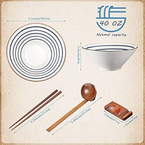 Ramen bowls set: the ceramic ramen bowls set includes 4 pieces of Japanese ramen bowls in different patterns, 4 pairs of chopsticks, 4 pieces spoons and 4 pieces of shelves, enough quantity can meet your daily family use or entertain guests Proper size: the ceramic soup bowls are approx. 1.2L capacity, large enough to protect soup from spills. 8 inches in diameter, suitable for rice, cake, cereal, popcorn, pasta, soup, salad, pasta, dessert and more QUALITY & SAFE Our Japanese large ceramic ramen bowls, chopsticks, spoons and shelves are made of high quality ceramic and wood materials, sturdy and reliable, stackable and microwave, oven, freezer and dishwasher safe Delicate design: the Japanese large ramen bowls have different blue and white patterns, bright and vivid in appearance, so they are loved by most people, providing you with a pleasant using experience Wide applications: the ceramic bowls are essential accessories for your daily household, office, restaurant and other places, also nice for various events and parties, besides, they can be easily cleaned › See more product details; Product description Features: The ceramic ramen bowls offer you the ideal choice to give your lover, friends, family, neighbors, colleagues or other people at the housewarming party, wedding, anniversary, birthday, festivals and other meaningful occasions. The ramen bowls are approx. 8 x 3.2 inches, the spoons are approx. 21.5 cm, the shelves are approx. 7.1 x 3 cm and the chopsticks are approx. 23.5 cm long, suitable for most people. Specifications: Material: high quality ceramic and wood. Color: as picture show Size: as shown in the picture. Bowl capacity: approx. 1.1 L Package includes: 4 x Bowls 4 Pairs Chopsticks 4 x Spoons 4 x Shelves Notes: Manual measurement, please allow slight errors on size. The color may exist slight difference due to different displays. Please put it on carefully.; Product description Features: The ceramic ramen bowls offer you the ideal choice to give your lover, friends, family, neighbors, colleagues or other people at the housewarming party, wedding, anniversary, birthday, festivals and other meaningful occasions. The ramen bowls are approx. 8 x 3.2 inches, the spoons are approx. 21.5 cm, the shelves are approx. 7.1 x 3 cm and the chopsticks are approx. 23.5 cm long, suitable for most people. Specifications: Material: high quality ceramic and wood. Color: as picture show Size: as shown in the picture. Bowl capacity: approx. 1.1 L Package includes: 4 x Bowls 4 Pairs Chopsticks 4 x Spoons 4 x Shelves Notes: Manual measurement, please allow slight errors on size. The color may exist slight difference due to different displays. Please put it on carefully.; Features: The ceramic ramen bowls offer you the ideal choice to give your lover, friends, family, neighbors, colleagues or other people at the housewarming party, wedding, anniversary, birthday, festivals and other meaningful occasions. The ramen bowls are approx. 8 x 3.2 inches, the spoons are approx. 21.5 cm, the shelves are approx. 7.1 x 3 cm and the chopsticks are approx. 23.5 cm long, suitable for most people. Specifications: Material: high quality ceramic and wood. Color: as picture show Size: as shown in the picture. Bowl capacity: approx. 1.1 L Package includes: 4 x Bowls 4 Pairs Chopsticks 4 x Spoons 4 x Shelves Notes: Manual measurement, please allow slight errors on size. The color may exist slight difference due to different displays. Please put it on carefully.