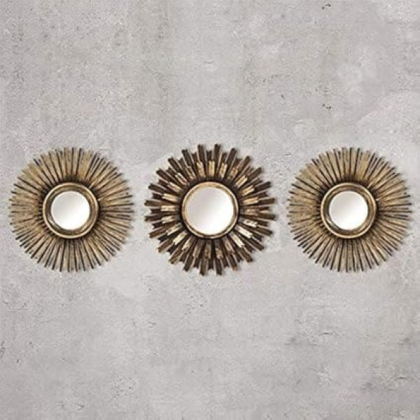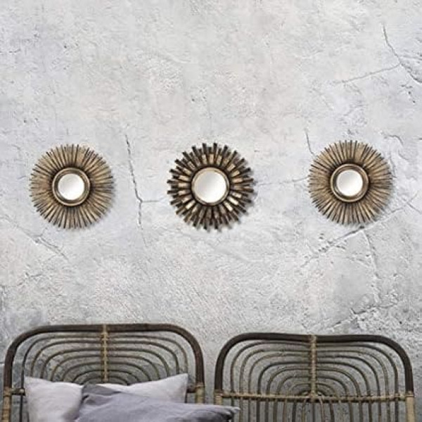 Dimensions - all our shabby chic wall mirrors measure approximately 25 x 25 x 2 cm. Mirror size: 7 x 7 cm. Material - all of our Sunburst mirrors are made of impact-resistant ABS plastic with glass mirrors. 3-piece mirror set - add a sophisticated flair to your living room with this upscale Better Homes and Gardens round Sunburst mirror set in gold or silver colours. Each Sunburst mirror has a distinctive mid-century modern flair. Arrange them together on a wall in a small space or over an installation for an artistic design. Shabby chic style - welcome the modern shabby chic style into your home with our stunning distressed-look wall mirrors. Uses – they are ideal for a living room or dining room where you will appreciate their beauty throughout the day. Pair these mirrors with shabby chic pieces such as picture frames, lamps, cushions, side tables, carpets and much more. › See more product details; Product description Bring a sophisticated flair to your living space with this upscale 3 piece round sunburst mirror set in gold or silver finish. Each sunburst mirror has a distinctive mid-century modern flair. Arrange them together on a wall in a small room or above a plant for an artistic design. They are ideal for a living room or dining room where you will appreciate their beauty all day long. Combine this mirror set with shabby chic pieces, such as picture frames, lamps, decorative cushions, side tables, rugs and much more. These mirrors also make the perfect gift for a new homeowner.; Product description Bring a sophisticated flair to your living space with this upscale 3 piece round sunburst mirror set in gold or silver finish. Each sunburst mirror has a distinctive mid-century modern flair. Arrange them together on a wall in a small room or above a plant for an artistic design. They are ideal for a living room or dining room where you will appreciate their beauty all day long. Combine this mirror set with shabby chic pieces, such as picture frames, lamps, decorative cushions, side tables, rugs and much more. These mirrors also make the perfect gift for a new homeowner.; Bring a sophisticated flair to your living space with this upscale 3 piece round sunburst mirror set in gold or silver finish. Each sunburst mirror has a distinctive mid-century modern flair. Arrange them together on a wall in a small room or above a plant for an artistic design. They are ideal for a living room or dining room where you will appreciate their beauty all day long. Combine this mirror set with shabby chic pieces, such as picture frames, lamps, decorative cushions, side tables, rugs and much more. These mirrors also make the perfect gift for a new homeowner.
