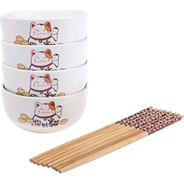 lachineuse - Set of 4 Japanese Cats Bowls - Rice Bowls, Breakfast & Soup - Chopsticks - Tableware Cat Maneki Neko Lucky Charm - Original Gift - Kawaii Japan - White