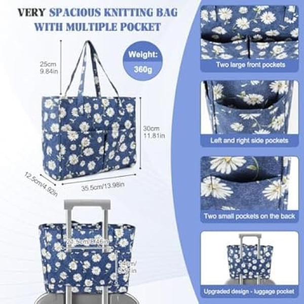 Aeelike Blue Daisy Knitting Bag for On the Go 35.5 x 30 x 12.5 cm, Portable Storage Bag for Wool, Crochet Hooks, Accessories, Knitting Needles Storage, Handmade Bag for Knitting, Crochet