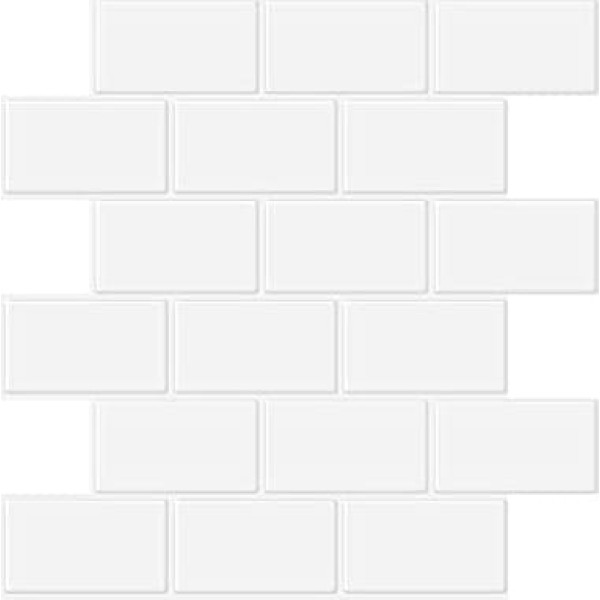 Subway Design Classic white subway design, with a transparent 3D gel-like texture over the design for a comfortable touch. STRONG ADHESIVE Upgraded adhesive, long holding force, stick firmly to the surface and won't fall off. 1.6mm Thickness:Hard enough, more durable, does not bend, no need for careful sticking, no bubbles. SUITABLE SURFACES Applicable to carefully cleaned surfaces such as wallpaper, wood, glass, ceramic tiles, walls, iron sheets, etc. Widely Use:Self adhesive tiles for renovating kitchen, bathroom, living room, laundry room, fireplace, hallway, stairs and so on to beautify your home. DIMENSIONS & PACKAGE INCLUDES 30cm x 30cm each sheet, 10 peel and stick tile sheets/set + an installation instruction + a box. 10 sheets cover approx. 90 cm². › See more product details