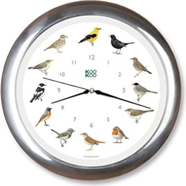 Our classic: the songbirds bird voice watch. A charming wall clock featuring a vividly designed coloured dial with 12 illustrations by renowned bird artists. At every hour, you will hear approx. For 10 seconds, the singing of one of 12 domestic songbirds - from the blackbird to the oriole to the nightingale. Real bird voices, taken in the wild. Children can be playfully inspired by the bird world and recognise the bird voices outside. Additional interesting details about the singing birds' special features, singing and habitats can be found in the included booklet \; Product description KooKoo Songbird wall clock, chrome, with bird voices at every hour, 34 cm, quartz movement.; Product description KooKoo Songbird wall clock, chrome, with bird voices at every hour, 34 cm, quartz movement.; KooKoo Songbird wall clock, chrome, with bird voices at every hour, 34 cm, quartz movement.