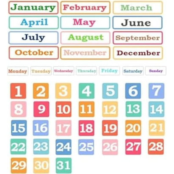 1. Suitable Size The size of monthly magnets is 6 inches long and 3 inches high; The weekday magnets are 2.2 x 1 inches; the magnetic numbers for whiteboards are 2 inches, proper size for you to use; Comprehensive set: contains 50 magnets with all days of the week as well as the months of the year. Perfect for long-term planning and daily reminders. 2. VERSATILE DESIGN Designed to seamlessly stick and remove from any magnetic surface, these magnets are ideal for whiteboards and refrigerators. 3. COLORFUL AND EYE-CATCHING Bright vibrant colors make your calendar stand out, making it easy to see at a glance. 4. DURABLE & DURABLE Made of high quality magnetic material, these magnets are built to withstand frequent use and stay strong over time. 5. EDUCATIONAL AND DECORATIVE Great for classrooms where students can learn while staying organized. Also great for offices and homes, adding a personal touch to your space. › See more product details; Product description 1. Suitable Size The size of monthly magnets is 6 inches long and 3 inches high; The weekday magnets are 2.2 x 1 inches; the magnetic numbers for whiteboards are 2 inches, proper size for you to use; Comprehensive set: contains 50 magnets with all days of the week as well as the months of the year. Perfect for long-term planning and daily reminders. 2. VERSATILE DESIGN Designed to seamlessly stick and remove from any magnetic surface, these magnets are ideal for whiteboards and refrigerators. 3. COLORFUL AND EYE-CATCHING Bright vibrant colors make your calendar stand out, making it easy to see at a glance. 4. DURABLE & DURABLE Made of high quality magnetic material, these magnets are built to withstand frequent use and stay strong over time. 5. EDUCATIONAL AND DECORATIVE Great for classrooms where students can learn while staying organized. Also great for offices and homes, adding a personal touch to your space.; Product description 1. Suitable Size The size of monthly magnets is 6 inches long and 3 inches high; The weekday magnets are 2.2 x 1 inches; the magnetic numbers for whiteboards are 2 inches, proper size for you to use; Comprehensive set: contains 50 magnets with all days of the week as well as the months of the year. Perfect for long-term planning and daily reminders. 2. VERSATILE DESIGN Designed to seamlessly stick and remove from any magnetic surface, these magnets are ideal for whiteboards and refrigerators. 3. COLORFUL AND EYE-CATCHING Bright vibrant colors make your calendar stand out, making it easy to see at a glance. 4. DURABLE & DURABLE Made of high quality magnetic material, these magnets are built to withstand frequent use and stay strong over time. 5. EDUCATIONAL AND DECORATIVE Great for classrooms where students can learn while staying organized. Also great for offices and homes, adding a personal touch to your space.; 1. Suitable Size The size of monthly magnets is 6 inches long and 3 inches high; The weekday magnets are 2.2 x 1 inches; the magnetic numbers for whiteboards are 2 inches, proper size for you to use; Comprehensive set: contains 50 magnets with all days of the week as well as the months of the year. Perfect for long-term planning and daily reminders. 2. VERSATILE DESIGN Designed to seamlessly stick and remove from any magnetic surface, these magnets are ideal for whiteboards and refrigerators. 3. COLORFUL AND EYE-CATCHING Bright vibrant colors make your calendar stand out, making it easy to see at a glance. 4. DURABLE & DURABLE Made of high quality magnetic material, these magnets are built to withstand frequent use and stay strong over time. 5. EDUCATIONAL AND DECORATIVE Great for classrooms where students can learn while staying organized. Also great for offices and homes, adding a personal touch to your space.