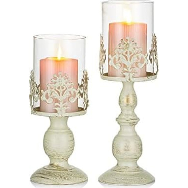 Package includes: 1 x 26.8 cm and 1 x 33 cm height centrepieces vintage white pillar candle holder. Candles are not included. As the packaging is not strong enough in the early stages, the glass may be easily damaged during transport. Now our packaging has been upgraded and you can buy it with confidence! Antique candle holder: this metal candlestick surface is old, waxed and painted by hand. Powder coated with white paint and finished with antique style brush strokes, it gives a desperate vintage look. With decorative white leaves around the stand, the whole thing has the classic taste of the Middle Ages, retro chic and smooth lines Suitable for: the white candle holder comes with a removable glass hurricane, which is 6 inches tall and 3.74 inches wide. We recommend using pillar candles in the format 3 x 6 inches to achieve the best results when presenting.