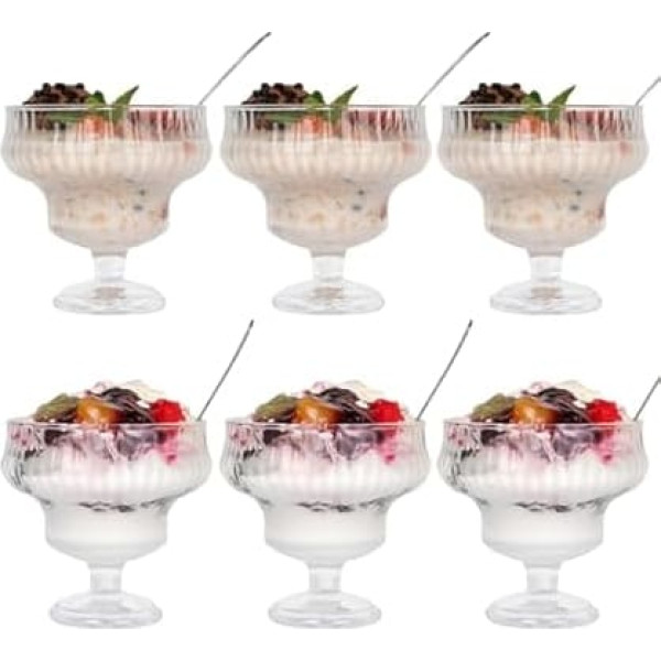 VERSATILE DESSERT CUPS AND SPOONS SET This 12 piece set includes 6 footed dessert bowls and 6 premium spoons, perfect for serving sundaes, salad bowl, milkshakes, truffles, parfait, panna cotta trifle and tiramisu. MULTIPURPOSE In addition to desserts, these large ice cream cups glass cups can also be used for serving spices, snacks, breakfast, crab cocktails, champagne, martini glasses and drinking glasses, or as decorative pieces. ELEGANT DESIGN The footed dessert glasses (H 4.1 \