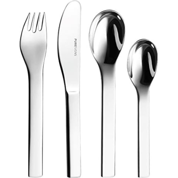 1 x fork, 1 x knife, 1 x spoon, 1 x small spoon (length = 158 mm, 158 mm, 167 mm, 130 mm) Polished 18/10 stainless steel, rust-proof and dishwasher safe Spoon, fork, knife and the small spoon are carefully crafted and pleasantly soft rounded. Ergonomically shaped and ideal for small children's hands. Ideal for children aged 2-3 years and above for independent eating. Design: Schaeferdesign › See more product details