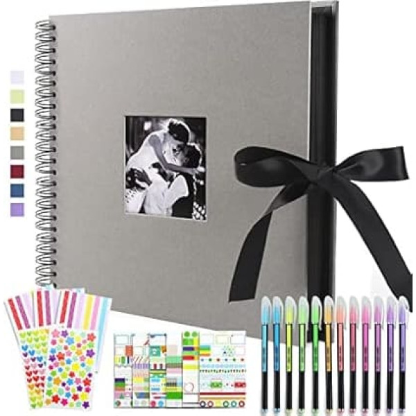 Photo album accessories: includes a scrapbook photo album, pens x 12 in different colours, stickers x 8 in different types, 3 x photo corners and 1 gift box. This is a DIY album where you can let your imagination run wild Dimensions: length 30 x width 30 (cm), total 80 pages (40 sheets), which can hold 400 10x15 photos. The small window design of the album cover allows you to display your favorite photos Practical design: with the two straps on the cover, the album can be closed. You can tie the ribbon into a bow or other favorite style. The spiral binding design allows the album to be rotated and laid flat 360 degrees for easy viewing and insertion High Quality Scrapbook The cardboard cover can effectively prevent the deformation of the album. The special interior with high hardness can withstand sharp pen writing and repeated use of glue. It is non-fading, durable, and suitable for long-term storage COLLECTION OF MEMORIES This is a DIY photo album. You can use your imagination. And it can record travel, weddings and family life. I believe that it will be the ideal album to collect your good times › See more product details