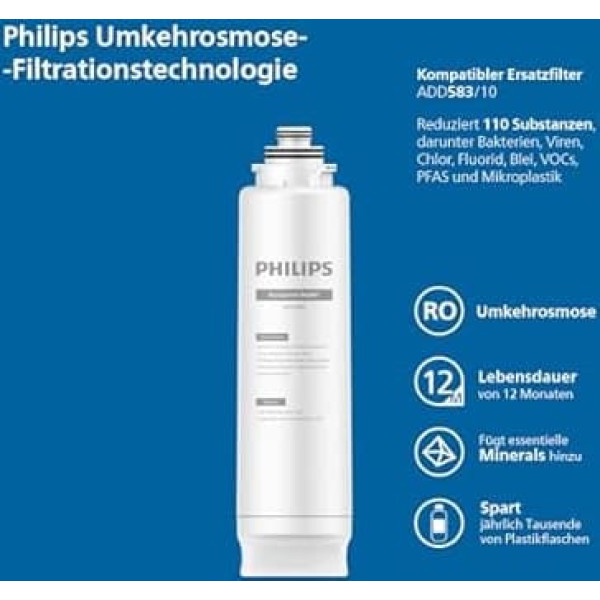 Aquaporin Inside: Natural based reverse osmosis technology for pure water. Eliminates up to 110 substances: including PFOA, heavy metals and microplastics up to 0.0001 microns in size INSTANT HEATING Choose between 99 C, 45 C and normal water temperature with just one touch or set your own temperature 1 Year Filter Lifespan: enjoy constant performance with automatic monitoring of life 2 x 1.8 litre containers in the package. Automatically refill the jug so your water is always ready Real-time monitoring of water quality: TDS (Total Dissolved Solids) always visible before and after cleaning Choose from 3 quantity presets: Automatically fill your cup with 150, 200 and 300 ml. 6L WATER TANK - Enjoy a longer service life without frequent refilling. Intuitive touch display: effortlessly select your desired temperature and volume. REMINERALISING FILTER - Improves the taste of the water and adds minerals after purification. Compatible replacement filter: ADD583/10. Show More › See more product details