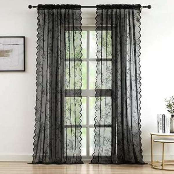 Bujasso Black Lace Curtains Vintage Floral Sheer 54 Inch Rod Pocket Light Filtering Victorian Gothic Wavy Window Treatment for Living Room Bedroom
