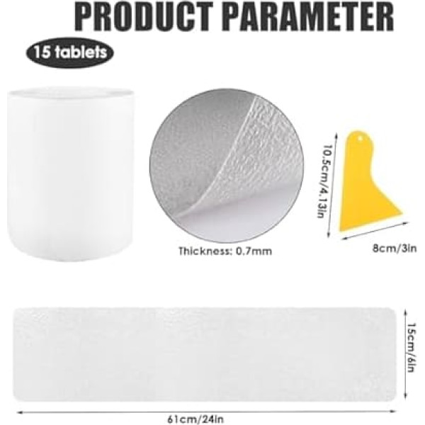 Healthy and durable: Stair mats inside 15 pieces uses non-toxic, non-slip, odourless, PVC-free and chlorine-free PEVA material for the safety of children, adults, seniors and pets. Perfect fit: carpet stairs 60 cm x 15 cm, suitable for wooden stairs, bamboo stairs and concrete stairs. Ideal for decorative surfaces such as wooden floors, tiles and patios. Non-slip mat stairs Litchi pattern surface and transparent design: the waterproof transparent surface of stairs non-slip protection has a lychee pattern that increases friction and improves slip resistance. Fashionable patterns perfectly match stairs in different decoration styles. Excellent slip resistance: a too smooth stair surface can easily lead to falls. Stair mat provides the safest protection for your family, suitable for adults, dogs, seniors and children, whether barefoot or with socks. Easy installation and cleaning: clean the stairs, peel off the protective film from the back of the self-adhesive stair mats, stick it to the stairs and make it smooth. Dust and waterproof, easy to clean. › See more product details; Product description Transparent design: rectangular stair mats. Stair non-slip strips are transparent and does not affect the original colour of the stairs after installation, fits perfectly with different decoration styles. Stair steps protection Self-adhesive design: non-slip stairs. Self-adhesive stair mats have a strong adhesive strength and adheres firmly to various surfaces such as hardwood, granite, marble and other smooth materials. Stair mats Versatile – carpet stair steps self-adhesive. Transparent stair mats are suitable for decorative surfaces such as wooden floors, tiles and patios, but can also be used for stairs, concrete, metal, plastic, floor mats, carpets, shoe handles, skateboard handles, ramps, boats and motorcycles. Non-slip for indoor stairs. Sturdy stairs. Easy to install, disassemble and clean - step mats. Installation, cleaning and disassembly are convenient and quick! Cleaning requires only a damp cloth or mop. Carpet step mats self-adhesive can be easily removed without leaving any residue without damaging the surface. Stair treads mats non-slip mat. Product specifications: Material: PEVA Size: 15 x 60 cm / piece. Colour: transparent. Package includes: 15 x non-slip mats for stairs, indoors. 1 x scraper. Notes: Stair rugs are measured by hand, so there may be slight deviations.; Product description Transparent design: rectangular stair mats. Stair non-slip strips are transparent and does not affect the original colour of the stairs after installation, fits perfectly with different decoration styles. Stair steps protection Self-adhesive design: non-slip stairs. Self-adhesive stair mats have a strong adhesive strength and adheres firmly to various surfaces such as hardwood, granite, marble and other smooth materials. Stair mats Versatile – carpet stair steps self-adhesive. Transparent stair mats are suitable for decorative surfaces such as wooden floors, tiles and patios, but can also be used for stairs, concrete, metal, plastic, floor mats, carpets, shoe handles, skateboard handles, ramps, boats and motorcycles. Non-slip for indoor stairs. Sturdy stairs. Easy to install, disassemble and clean - step mats. Installation, cleaning and disassembly are convenient and quick! Cleaning requires only a damp cloth or mop. Carpet step mats self-adhesive can be easily removed without leaving any residue without damaging the surface. Stair treads mats non-slip mat. Product specifications: Material: PEVA Size: 15 x 60 cm / piece. Colour: transparent. Package includes: 15 x non-slip mats for stairs, indoors. 1 x scraper. Notes: Stair rugs are measured by hand, so there may be slight deviations.; Transparent design: rectangular stair mats. Stair non-slip strips are transparent and does not affect the original colour of the stairs after installation, fits perfectly with different decoration styles. Stair steps protection Self-adhesive design: non-slip stairs. Self-adhesive stair mats have a strong adhesive strength and adheres firmly to various surfaces such as hardwood, granite, marble and other smooth materials. Stair mats Versatile – carpet stair steps self-adhesive. Transparent stair mats are suitable for decorative surfaces such as wooden floors, tiles and patios, but can also be used for stairs, concrete, metal, plastic, floor mats, carpets, shoe handles, skateboard handles, ramps, boats and motorcycles. Non-slip for indoor stairs. Sturdy stairs. Easy to install, disassemble and clean - step mats. Installation, cleaning and disassembly are convenient and quick! Cleaning requires only a damp cloth or mop. Carpet step mats self-adhesive can be easily removed without leaving any residue without damaging the surface. Stair treads mats non-slip mat. Product specifications: Material: PEVA Size: 15 x 60 cm / piece. Colour: transparent. Package includes: 15 x non-slip mats for stairs, indoors. 1 x scraper. Notes: Stair rugs are measured by hand, so there may be slight deviations.