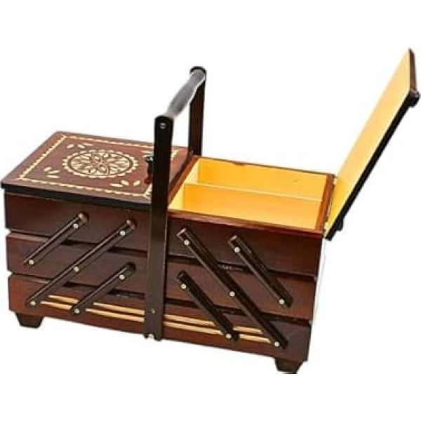 Sewing box for organising your sewing utensils, L/W/H 41 x 20 x 21 cm. The sewing box shows high quality craftsmanship and attention to detail. It has been carefully crafted to ensure a classy look. The veneer wood gives it an elegant design and durability. With its seven partly extendable compartments, handles, feet and meticulous workmanship, it offers an elegant solution to keep your sewing projects organised while providing an aesthetic addition to your space. The sewing box is not only used to store your sewing utensils, but is also a beautiful decorative object for rooms that are kept in wood style. The sewing case is available in natural and dark brown. Gift your loved ones with this great sewing box made of real wood. The handmade basket made of real veneer wood is the perfect gift for your sewing friend. › See more product details; Product description The sewing box is made of high-quality veneer wood and is finished in an attractive dark brown tone. This choice of colours of the sewing box gives it a classic and timeless look that will look great in any room. The sewing box is designed to be aesthetically pleasing and functional. The sewing basket has seven partly extendable compartments that provide you with enough space to organise sewing thread, needles, scissors, buttons and other sewing accessories. The compartments of the sewing box are easy to open and close and provide a clear overview of your sewing needs. The sewing box is equipped with a total of four handles - two on the sides and two on the front. These handles make it easy to transport and handle the box. In addition, the sewing box has four feet that not only keep the furniture stable, but also ensure that the sewing box is protected from dirt when it is on the floor. The sewing case has generous dimensions of approx. 42 cm in length, 20 cm in width and 21 cm in height. This size provides enough space for your sewing supplies without being too bulky.; Product description The sewing box is made of high-quality veneer wood and is finished in an attractive dark brown tone. This choice of colours of the sewing box gives it a classic and timeless look that will look great in any room. The sewing box is designed to be aesthetically pleasing and functional. The sewing basket has seven partly extendable compartments that provide you with enough space to organise sewing thread, needles, scissors, buttons and other sewing accessories. The compartments of the sewing box are easy to open and close and provide a clear overview of your sewing needs. The sewing box is equipped with a total of four handles - two on the sides and two on the front. These handles make it easy to transport and handle the box. In addition, the sewing box has four feet that not only keep the furniture stable, but also ensure that the sewing box is protected from dirt when it is on the floor. The sewing case has generous dimensions of approx. 42 cm in length, 20 cm in width and 21 cm in height. This size provides enough space for your sewing supplies without being too bulky.; The sewing box is made of high-quality veneer wood and is finished in an attractive dark brown tone. This choice of colours of the sewing box gives it a classic and timeless look that will look great in any room. The sewing box is designed to be aesthetically pleasing and functional. The sewing basket has seven partly extendable compartments that provide you with enough space to organise sewing thread, needles, scissors, buttons and other sewing accessories. The compartments of the sewing box are easy to open and close and provide a clear overview of your sewing needs. The sewing box is equipped with a total of four handles - two on the sides and two on the front. These handles make it easy to transport and handle the box. In addition, the sewing box has four feet that not only keep the furniture stable, but also ensure that the sewing box is protected from dirt when it is on the floor. The sewing case has generous dimensions of approx. 42 cm in length, 20 cm in width and 21 cm in height. This size provides enough space for your sewing supplies without being too bulky.
