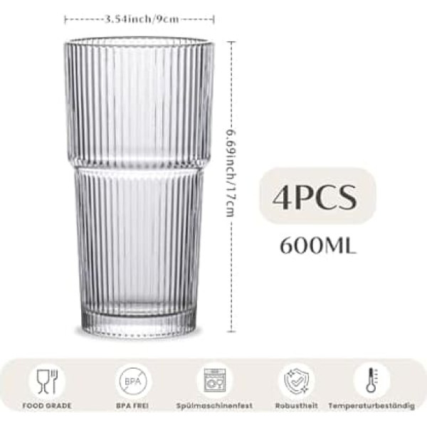 Generous 600ml capacity for versatile use: each glass holds up to 600ml, perfect for iced coffee, water, juice, smoothies and cocktails. This large capacity keeps you hydrated without constant refilling, and is ideal for home, office or gatherings. ELEGANT RIBBLED DESIGN FOR A TOUCH OF CLASS The fluted pattern enhances the aesthetic effect and provides a secure grip, reducing slipping. The modern, timeless design fits any kitchen decor and is suitable for both everyday use and special occasions. DURABLE AND SAFE GLASS BUILD Made from thick, high quality glass, these BPA free glasses are designed for everyday use and retain their clarity and beauty. Their sturdy construction ensures safety and reduces the risk of breakage compared to thinner glass. EASY TO CLEAN AND MAINTAIN These durable glasses are dishwasher safe and easy to clean, so they retain their pristine look after frequent use. The sturdy design ensures that they can withstand regular washing without losing clarity or structure. BPA free and dishwasher safe. PERFECT GIFT IDEA FOR ANY OCCASION This set of four fluted glasses are beautifully packaged and make a great thoughtful gift for housewarming, weddings, birthdays or holidays. Their elegant design and practicality make them a treasured gift. GREAT FOR ALL YOUR FAVORITE DRINKS Perfect for cold brew, water or cocktails, these 600ml BPA free glasses are versatile and generous, great for layered drinks or adding plenty of ice to enhance your drinking experience. Dishwasher safe for added convenience. › See more product details