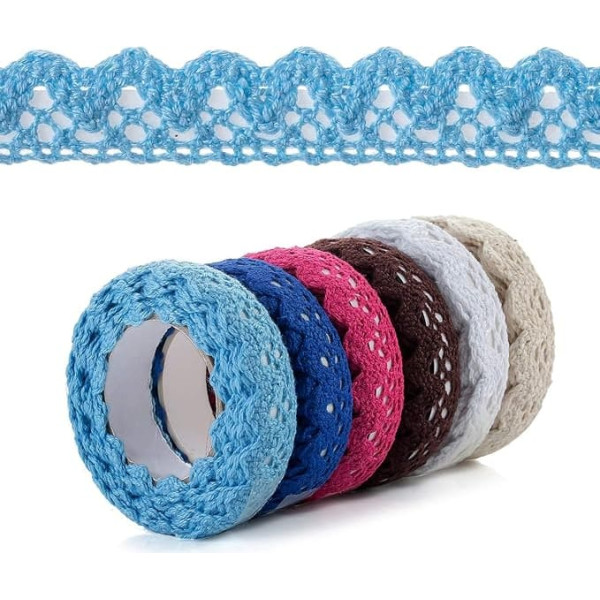 6 rolls of colour lace ribbon set Material: cotton, colour: 6 styles The decorative ribbon is very simple and easy to work with. Easy to cut, peel off the film from the self-adhesive tape at the back and stick on Each ribbon is 1.5 cm (wide) x 2 yard (1.8 m long) for crafting, 6 colours in vintage style Wide application: this lace ribbon set is perfect for DIY crafts, including decorating albums, picture frames, bottles and much more. › See more product details; Product description Each ribbon is 1.5 cm (wide) x 2 yard (1.8 m long) for crafting, 6 colours in vintage style; Product description Each ribbon is 1.5 cm (wide) x 2 yard (1.8 m long) for crafting, 6 colours in vintage style; Each ribbon is 1.5 cm (wide) x 2 yard (1.8 m long) for crafting, 6 colours in vintage style