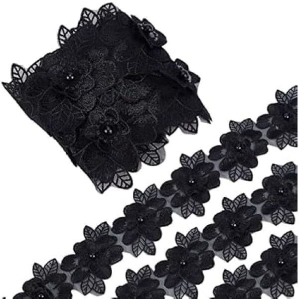 GORGECRAFT 2 Yard 3D Polyester Lace Ribbon with Flower Lace Beads Edges Trim Embroidered Applique Fabric Vintage Sewing Craft for Wedding Dress Embellishment DIY Dress Decoration (Black)