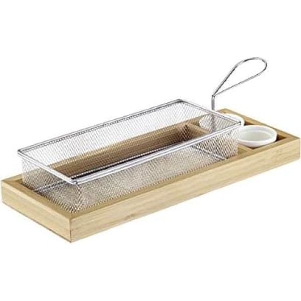 For use in catering or at home for attractive serving of chips, fried food or finger food, sturdy construction basket 21.5 x 9.5 x 5.5 cm made of stainless steel tray made of bamboo, 2 small ceramic pots for sauces Partially dishwasher-safe › See more product details