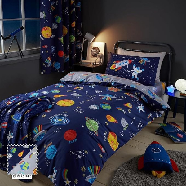 Single Duvet Cover Set: 135 x 200 cm + 1 Pillowcase 50 x 75 cm 52% Polyester, 48% Cotton Wash before use. Machine washable at 40°C. Tumble dryer-safe › See more product details; Product description Transform the nursery into something that is out of this world. Featuring colorful illustrations of planets, rockets, astronauts and spaceships on a dark blue base, this bedding is perfect for little adventurers. The fully reversible design allows for quick and easy change with a matching grey colourway for a fresh new look. Made from easy care and durable poly-cotton fabric for everyday use.; Product description Transform the nursery into something that is out of this world. Featuring colorful illustrations of planets, rockets, astronauts and spaceships on a dark blue base, this bedding is perfect for little adventurers. The fully reversible design allows for quick and easy change with a matching grey colourway for a fresh new look. Made from easy care and durable poly-cotton fabric for everyday use.; Transform the nursery into something that is out of this world. Featuring colorful illustrations of planets, rockets, astronauts and spaceships on a dark blue base, this bedding is perfect for little adventurers. The fully reversible design allows for quick and easy change with a matching grey colourway for a fresh new look. Made from easy care and durable poly-cotton fabric for everyday use.