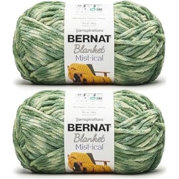 JUMBO POLYESTER YARN Our extra thick Bernat blanket yarn is the perfect yarn for knitting, crochet, amigurumi and craft projects. This 100% polyester yarn is easy to care for, simply machine wash and dry. PERFECT FOR BLANKETS, BLANKETS & CHUNKY KNITTED SWEATERS/BLANKETS - With a length of 201m per ball and weighing 300g, this super bulky yarn #6 is compatible with 8mm knitting needles and 8mm crochet hooks, providing flexibility for the creations from chunky sweaters to blankets to amigurumi and everything in between. Simply put, our yarn is extremely versatile. The Bernat extra jumbo yarn is perfect for knitting and crocheting: 10 x 10 cm, 8 stitches x 13 r with 8 mm knitting needle, 10 x 10 cm, 7 x 8 r with 8 mm crochet hook. Bernat Yarn: Bernat yarn is a good choice for the whole family, with great yarns for fashion, home decoration projects and babies! From proven basics to state-of-the-art textures, there's a yarn for every project. With premium baby yarns that are safety certified, fashionable clothing yarn and classic home decor yarn, you'll love knitting and crocheting all your craft projects with Bernat yarns. The Bernat blanket gets a little foggy with this brand new dyeing effect. Bernat Blanket Mist-ical takes our beloved Bernat blanket yarn and adds a new watercolour marbling effect, creating pockets in darker colour to add texture and definition to your projects. Perfect for adding a touch of magic to any stitch. › See more product details; Product description Bernat The blanket will be a little foggy with this brand new dyeing effect. Bernat Blanket Mist-ical takes our beloved Bernat blanket yarn and adds a new watercolor marbling effect, creating pockets of darker color to add texture and definition to your projects. Perfect for adding a touch of magic to any stitch, this yarn allows you to visually create complex projects with little effort and enchant anyone who sees them. Machine washable and dryable, so it is easy to maintain and preserve the beauty of your finished projects.; Product description Bernat The blanket will be a little foggy with this brand new dyeing effect. Bernat Blanket Mist-ical takes our beloved Bernat blanket yarn and adds a new watercolor marbling effect, creating pockets of darker color to add texture and definition to your projects. Perfect for adding a touch of magic to any stitch, this yarn allows you to visually create complex projects with little effort and enchant anyone who sees them. Machine washable and dryable, so it is easy to maintain and preserve the beauty of your finished projects.; Bernat The blanket will be a little foggy with this brand new dyeing effect. Bernat Blanket Mist-ical takes our beloved Bernat blanket yarn and adds a new watercolor marbling effect, creating pockets of darker color to add texture and definition to your projects. Perfect for adding a touch of magic to any stitch, this yarn allows you to visually create complex projects with little effort and enchant anyone who sees them. Machine washable and dryable, so it is easy to maintain and preserve the beauty of your finished projects.