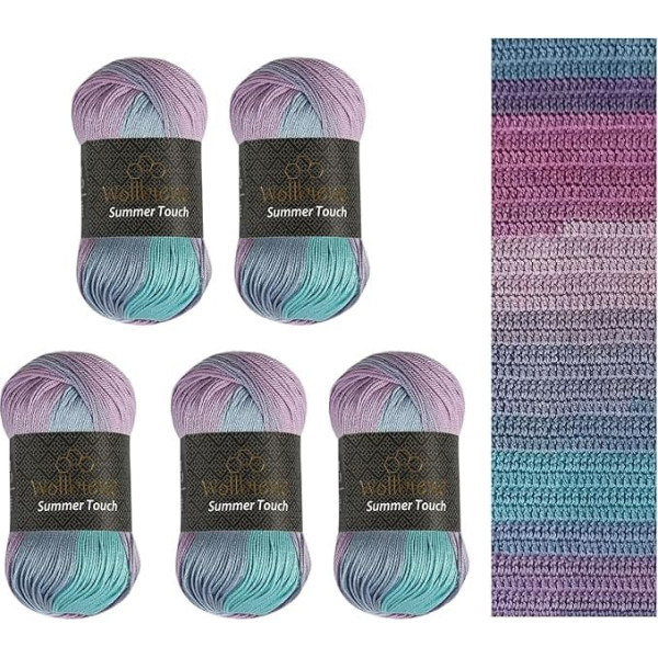 5 x 100 g knitting wool, fine microfibre acrylic Multi-coloured with colour gradient 320 m per ball, total 1600 metres Mercerised, for silk-like shine › See more product details; Product description Wollbiene Summer Touch material: 100% fine microfibre acrylic, mercerised for a silk-like shine, length: 100g/320m, knitting thickness: 3-4 mm, crochet thickness 2-3 mm, tension sample: knitting 10 x 10 cm, 31 stitches, 20 rows, tension sample: crochet 10 x 10 cm, 25 stitches, 15 rows. Box contents: 5 x 100 cm. g g g Description: Our Wollbiene Summer Touch batik is a soft, easy-care microfibre acrylic yarn. It is mercerised for a silk-like shine. We have a lot of selection of wonderful colour gradients that enchant on the needle. Whether knitting or crochet, accessories or clothing – let your imagination run wild, nothing stands in the way of ideas! Care instructions: washable at 30 degrees, gentle cycle, low rotation speed when spinning, liquid fine or wool detergent, dry knitwear lying on a towel and pulling into the correct shape, do not dry in direct sunlight. Colours may vary from monitor to monitor. Wollbiene, your brand. Once you have started your project, you can't stop and get rid of the wool and needle. Then you are just right with us, we provide you with the right wool. We are continuously expanding our range so that you can knit happily. Our goal is to offer the best quality at a fair price for you. Immerse yourself in our world, get creative and make yourself something beautiful!; Product description Wollbiene Summer Touch material: 100% fine microfibre acrylic, mercerised for a silk-like shine, length: 100g/320m, knitting thickness: 3-4 mm, crochet thickness 2-3 mm, tension sample: knitting 10 x 10 cm, 31 stitches, 20 rows, tension sample: crochet 10 x 10 cm, 25 stitches, 15 rows. Box contents: 5 x 100 cm. g g g Description: Our Wollbiene Summer Touch batik is a soft, easy-care microfibre acrylic yarn. It is mercerised for a silk-like shine. We have a lot of selection of wonderful colour gradients that enchant on the needle. Whether knitting or crochet, accessories or clothing – let your imagination run wild, nothing stands in the way of ideas! Care instructions: washable at 30 degrees, gentle cycle, low rotation speed when spinning, liquid fine or wool detergent, dry knitwear lying on a towel and pulling into the correct shape, do not dry in direct sunlight. Colours may vary from monitor to monitor. Wollbiene, your brand. Once you have started your project, you can't stop and get rid of the wool and needle. Then you are just right with us, we provide you with the right wool. We are continuously expanding our range so that you can knit happily. Our goal is to offer the best quality at a fair price for you. Immerse yourself in our world, get creative and make yourself something beautiful!; Wollbiene Summer Touch material: 100% fine microfibre acrylic, mercerised for a silk-like shine, length: 100g/320m, knitting thickness: 3-4 mm, crochet thickness 2-3 mm, tension sample: knitting 10 x 10 cm, 31 stitches, 20 rows, tension sample: crochet 10 x 10 cm, 25 stitches, 15 rows. Box contents: 5 x 100 cm. g g g Description: Our Wollbiene Summer Touch batik is a soft, easy-care microfibre acrylic yarn. It is mercerised for a silk-like shine. We have a lot of selection of wonderful colour gradients that enchant on the needle. Whether knitting or crochet, accessories or clothing – let your imagination run wild, nothing stands in the way of ideas! Care instructions: washable at 30 degrees, gentle cycle, low rotation speed when spinning, liquid fine or wool detergent, dry knitwear lying on a towel and pulling into the correct shape, do not dry in direct sunlight. Colours may vary from monitor to monitor. Wollbiene, your brand. Once you have started your project, you can't stop and get rid of the wool and needle. Then you are just right with us, we provide you with the right wool. We are continuously expanding our range so that you can knit happily. Our goal is to offer the best quality at a fair price for you. Immerse yourself in our world, get creative and make yourself something beautiful!