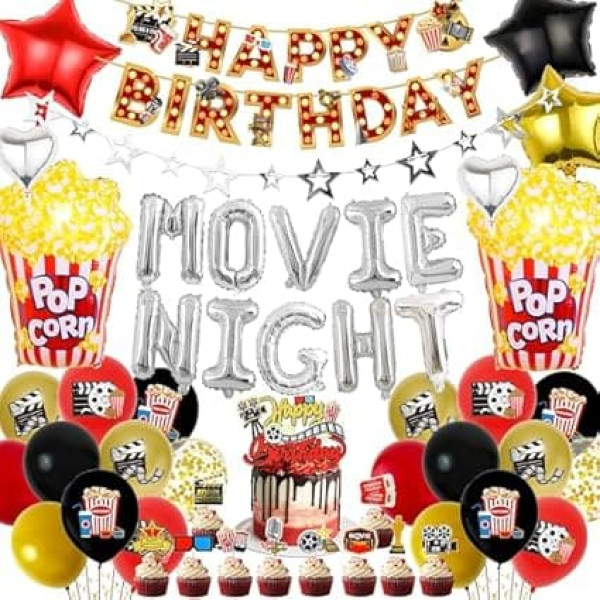 Filmnacht Zubehör Party Dekorationen - Kino Party Supplies Cupcake Toppers Popcorn Folie Stern Silber Buchstaben Luftballons, Happy Birthday Banner Girlande für Geburtstag Film Thema Party Dekoration
