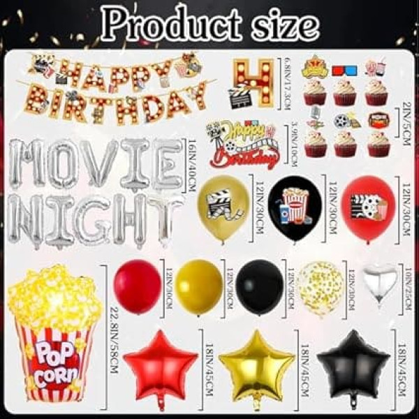 【Movie Night Party Set】Enthält 15 x Banner, 1 x Girlande, 10 x Cupcake-Topper, 1 x Tortenaufsatz, 10 x Buchstabenballons, 20 x Latexballons, 2 x Popcorn-Ballons, 2 x 10-Zoll-Herzballons, 3 x 18-Zoll-Sternballons, schafft eine kinothematische Atmosphäre Auffällige Popcorn- und Sternballons: Mit Popcorn-Folienballons und silbernen Buchstaben-Herzballons bringt dieses Filmabend-Zubehör-Set eine klassische Kinoatmosphäre, wodurch Ihre Feier auf Fotos und Videos hervorstechen wird 【Cupcake-Topper für zusätzlichen Spaß】 Enthält Cupcake-Topper mit Filmthemen in verschiedenen Stilen, die Kuchen, Cupcakes und Snacks Aufregung verleihen. Diese dekorativen Aufsätze heben den Desserttisch auf, begeistern die Gäste und verbessern das Partythema 【Einfach einzurichten】Leichte und einfach zu bedienende Dekorationen, mit selbst montierten Bannern und Cupcake-Toppern, der Dekorationsprozess ist einfach, spart Zeit und Energie und sorgt gleichzeitig für ein wunderbares Partyerlebnis 【Kino-Themen-Dekorationen】 Entworfen für Filmabende, Geburtstage, Preisverleihungen und Filmfestivals, passen diese Filmabenddekorationen zu verschiedenen Anlässen. Das Dekor verbessert das Party-Ambiente, sodass sich jede Veranstaltung wie ein roter Teppich anfühlt › See more product details