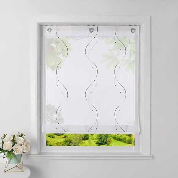 Material: 100% polyester, light and soft voile Roman blind Embroidery design: plain Roman curtains with white / grey / green / sand / purple wave embroidery, modern style Advantage: airy, conducive to indoor air circulation. The curtain can filter part of the sunlight to fill the room with soft light. Hanging: with hooks, installation is easy and no drilling is required. Width 60 cm with 2 hooks and 4 poles. Care instructions: machine wash at 30°C, can be dried and ironed. › See more product details; Product description Brand: Heichkell. Colours: white, grey, green, sand and purple. Fixed height 140 cm, but you can adjust the height steps. Irregular wave pattern, combination of thick and thin lines, smooth and natural. The embroidery is exquisite and can easily match your room decoration. Notes: 1. The stated dimensions are fabric dimensions, dimensions are approximate. 2. Please iron the curtain at low temperature before hanging.; Product description Brand: Heichkell. Colours: white, grey, green, sand and purple. Fixed height 140 cm, but you can adjust the height steps. Irregular wave pattern, combination of thick and thin lines, smooth and natural. The embroidery is exquisite and can easily match your room decoration. Notes: 1. The stated dimensions are fabric dimensions, dimensions are approximate. 2. Please iron the curtain at low temperature before hanging.; Brand: Heichkell. Colours: white, grey, green, sand and purple. Fixed height 140 cm, but you can adjust the height steps. Irregular wave pattern, combination of thick and thin lines, smooth and natural. The embroidery is exquisite and can easily match your room decoration. Notes: 1. The stated dimensions are fabric dimensions, dimensions are approximate. 2. Please iron the curtain at low temperature before hanging.