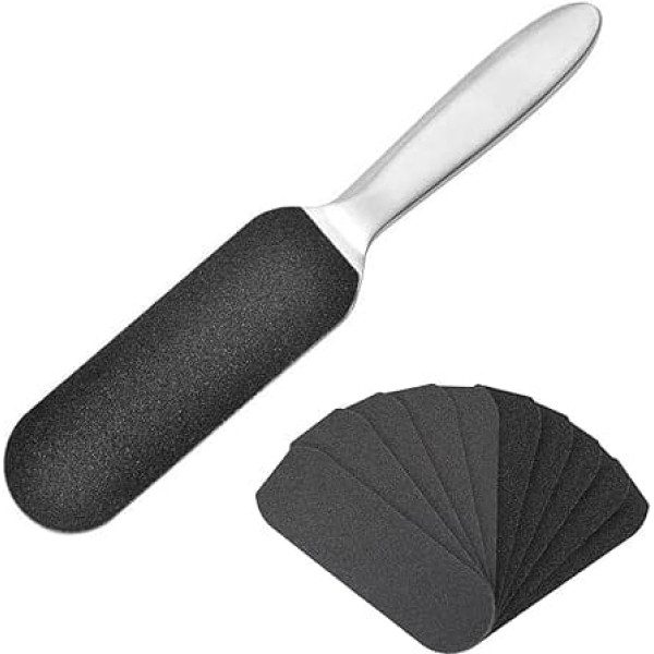 Nützliche Fußraspel Schrubber Edelstahl Pediküre Fußfeile mit 10 Stück doppelseitigem Ersatz Schleifpapier Bequeme Fußfeile Hornhautentferner