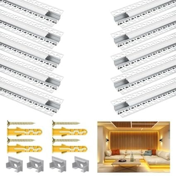 LED profile highlights: our extruded aluminium plaster profile in a beautiful design is perfect for indirect accent lighting of drywall, plasterboard, ceilings or wall decor. It produces a diffused light that is ideal for indoor and outdoor decorations and creates a visual effect that enhances the environment. Compatibility Advantage: The LED drywall profile is designed for LED strips with a width of less than 18 mm. It is compatible with Hue Light Strip Plus and most LED strips available on the market, offering the user a wide range of options while ensuring flexibility and easy installation. Protects and increases the service life: the LED aluminium profile protects the LED strips from dust, moisture and reduces glare. By effectively dissipating heat, it increases the life of the LED strips and creates a pleasant visual environment. LED Rail Accessories: our LED Profl set includes 10 LED diffusers, 40 end caps, 40 screws, 22 dowels and requires no separate accessories. Each channel is 1 metre long, allowing for flexible adjustment. The set has a total length of 6 metres (without LED strip). LED corner profile: our LED aluminium profiles are suitable for mounting in different places, such as ceilings, walls, floors, bedrooms, staircases as well as tiles, plasterboard, wood, mirrors, TV cabinets or cupboards. Thanks to the waterproof plasterboard, our product is also suitable for damp rooms such as kitchens and bathrooms. The LED rail system is durable and can be used for many years. › See more product details
