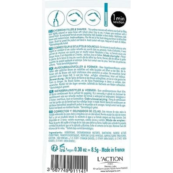 L'Action Paris offers three moments to take care of yourself : ONE MINUTE SOLUTION, SPA TIME, and OVERNIGHT SOLUTIONS. Our customers are invited to have an active attitude during those three moments. They will also customize the products to their own needs. \; Product description Product description Eyebrow filler and shaper: this eyebrow mascara gives light or sparse brows a natural and full look and thus opens the view. With it, the brows can be structured very easily without looking unnatural. The waterproof formula guarantees a long service life. There are three colours available: black-brown, brown and light brown. Application: use the tip of the brush along the brows to shape them into the desired shape. Brush the brows to distribute the small amount of product into them, then smudge. Avoid contact with eyes. Keep out of reach of children. *Dermatologically tested. Directions Run the end of the brush along your brows to define their shape. Brush to spread the product and blend in. Avoid contact with eyes. Keep away from children. Safety Warning Keep away from children. Avoid contact with the eyes. See more; Product description Product description Eyebrow filler and shaper: this eyebrow mascara gives light or sparse brows a natural and full look and thus opens the view. With it, the brows can be structured very easily without looking unnatural. The waterproof formula guarantees a long service life. There are three colours available: black-brown, brown and light brown. Application: use the tip of the brush along the brows to shape them into the desired shape. Brush the brows to distribute the small amount of product into them, then smudge. Avoid contact with eyes. Keep out of reach of children. *Dermatologically tested. Directions Run the end of the brush along your brows to define their shape. Brush to spread the product and blend in. Avoid contact with eyes. Keep away from children. Safety Warning Keep away from children. Avoid contact with the eyes. See more; Product description Eyebrow filler and shaper: this eyebrow mascara gives light or sparse brows a natural and full look and thus opens the view. With it, the brows can be structured very easily without looking unnatural. The waterproof formula guarantees a long service life. There are three colours available: black-brown, brown and light brown. Application: use the tip of the brush along the brows to shape them into the desired shape. Brush the brows to distribute the small amount of product into them, then smudge. Avoid contact with eyes. Keep out of reach of children. *Dermatologically tested. Directions Run the end of the brush along your brows to define their shape. Brush to spread the product and blend in. Avoid contact with eyes. Keep away from children. Safety Warning Keep away from children. Avoid contact with the eyes. See more