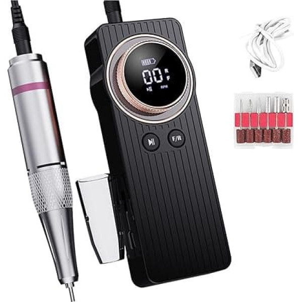 Powerful 35000 RPM Professional Nail Drill Bit - This professional nail cutter reaches a maximum speed of 35000RPM, ideal for filing, shaping and polishing gel and acrylic nails. Its performance ensures fast and efficient results, perfect for professional use. COMPLETE SET OF 6 INTERCHANGEABLE TIPS The set includes 6 interchangeable nail cutter tips, each designed for different manicure and pedicure needs. Simply switch from gel remover to detailed finish to ensure a comprehensive and versatile nail treatment. COMPACT & LIGHTWEIGHT DESIGN Designed with a compact and lightweight design, this nail cutter is easy to handle and carry. Perfect for use in the salon and at home, providing comfort and ease of use without hand fatigue. RECHARGEABLE BATTERY FOR MORE MOBILITY Equipped with a durable rechargeable battery, this professional nail file provides the freedom to work without cables. Ideal for professionals on the go or for anyone who wants a wireless manicure experience at home. ADJUSTABLE SPEED FOR PRECISE CONTROL Adjustable speed allows you to adjust the nail cutter to the specific needs of the treatment. Whether gentle work or aggressive removal, the speed control ensures maximum control and flawless results. › See more product details; Product description nail cutter; Product description nail cutter; nail cutter