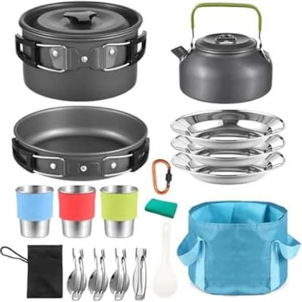 ALL IN ONE SOLUTION 22 piece camping cookware set includes 1 pot, 1 pan, 1 kettle, 3 plates, 3 cups, 3 foldable sporks, 1 rice ladle, 1 carabiner, 1 dishcloth, 1 storage bag for bucket, 1 mesh carry bag, 1 storage bag for sporks, suitable for 1-3 people.Knife, fork, spoon, pot in one set - no one set - Search more separately Quick cleaning: pot, pan and kettle are made of anodized aluminum alloy, are non-stick and easy to clean. The sporks, cups and cutters are made of stainless steel, corrosion-resistant, reliable and durable. Non-stick coating and rounded corners make rinsing on the go effortless. NON-SLIP HANDLE: Non-slip handles provide easy grip, collapsible for easy storage and space saving.Non-slip handles can be operated even with gloves - ideal in cold weather. Ergonomic design: rubber cup sleeves protect your hands from the heat.Special surface prevents food odours from sticking permanently. Compact: all parts nest perfectly, the compact design saves space in the backpack and is perfect for multi-day trekking tours. The set also comes with a mesh carry bag for easy transportation, making it ideal for camping, hiking, backpacking, picnics and other outdoor activities. › See more product details