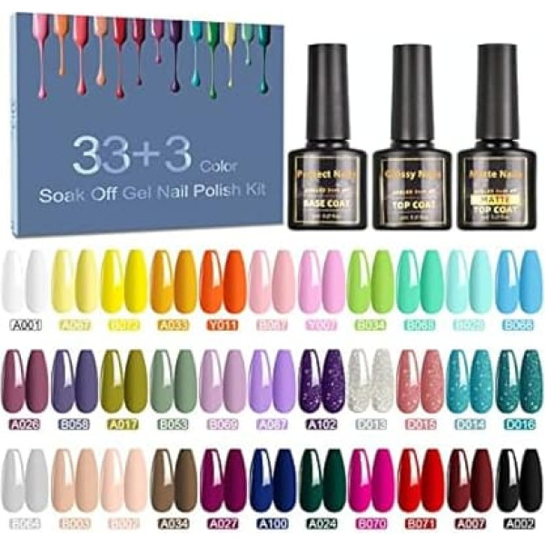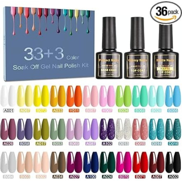 Vernis à Ongles Gel Semi Permanent 36 Pieces (33 Colours + 3 Base and Top Coat) Lot, UV LED Cadeau de Noël d'Art, Classiques Brilliant Populaires