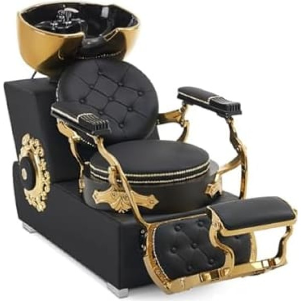 LUXURIOUS & RETRO: The combination of faux leather & golden frame and metal rivets & decorative buttons give the hairdressing chair exciting vintage look. The hairdressing chair with sink can be widely used in hairdressing salon, spa. ERGONOMIC DESIGN: 25° adjustable sink can be adjusted to suit multiple people of different sizes. In addition, the lumbar cushions and neck support provide extra support. The rotating footrest provides more relaxation position for your legs. Durable and robust: the advantages of the high-gloss, corrosion-resistant ceramic sink and PVC faux leather are their easy to clean, which facilitates care and maintenance. Thanks to its metal frame and the four foot pins, the hairdressing wash chair offers a high load capacity (150 kg) as well as good stability. Multifunctional accessories: the flexible and extendable shower head is more convenient for you to wash your hair. Drain strainer with the lid is used to reduce hair clogging and odor. With the hot/cold water tap, you can adjust the desired water temperature more easily. Easy to assemble and clean: Hairdresser wash area comes in 2 packages. ②Easy assembly is required. Detailed and pictorial assembly instructions are included. ③All fittings of the hairdressing chair are easy to clean. › See more product details