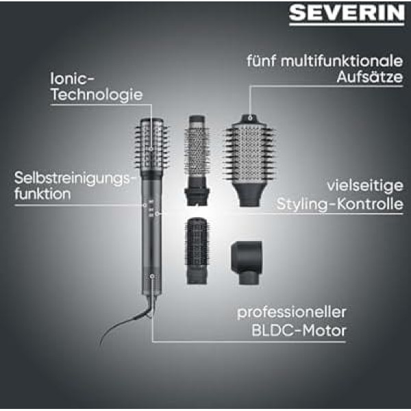 VIELSEITIGES ZUBEHÖR für individuelles Styling Konzentrator, zwei Rundbürsten (33 mm und 50 mm), ein ovaler Aufsatz (70 mm) und ein Paddelbürstenaufsatz ermöglichen ein personalisiertes Styling; Egal, ob kleine oder große Locken, glatte Looks oder Volumen; alles ist möglich mit dem Multistyler, auch dank seinem extra langem 2,80 m Kabel TEMPERATUREINSTELLUNG: Drei einstellbare Temperatur- und Geschwindigkeitsstufen der Föhnbürste liefern maßgeschneiderte Ergebnisse, während die Cool Shot Funktion den Look fixiert und den letzten Schliff gibt IONIC-TECHNOLOGIE für glänzendes Haar: Die Ionen-Funktion reduziert Frizz und sorgt für geschmeidiges, strahlendes Haar; Gleichzeitig pflegt der Hairstyler die Haare und verhindert statische Aufladung LEISTUNGSSTARKER BLDC-MOTOR: Mit 1.300 bis 1.500 W sorgt der Warmluftbürsten-Motor für eine schnelle und effiziente Trocknung: So sorgt die Thermal Brush für geeignete Profi-Ergebnisse, die großartig aussehen und lange halten DETAILS: SEVERIN Hot-Air-Multi-Styler 5-in-1, Ionic-Technologie, Rundbürstenföhn, Haarstyler, umfangreiches Zubehör, 1.500 W, Kabellänge: 2,80 m, Gewicht: 400 g, Artikelnr. 0684 › See more product details; Product description Der Multi Style Pro ist dein All-in-One-Wunder für Haare, das keine Wünsche offenlässt! Föhnen, glätten, voluminöse Wellen oder definierte Locken – mit diesem Power-Tool ist alles möglich. Ausgestattet mit einem 1.200-1.400 Watt BLDC-Motor und einem robusten Aluminiumgehäuse bietet der Multi Style Pro professionelle Leistung wie im Salon. Die drei Temperatur- und Leistungsstufen sowie die Kaltluftfunktion sorgen für absolute Präzision bei jedem Style. Dank der Ionenfunktion gehören Frizz und statisches Haar der Vergangenheit an – dein Haar glänzt wie nie zuvor! Egal, ob lässige Beach Waves oder glamouröse Locken: Mit den vielseitigen Aufsätzen kreierst du im Handumdrehen deinen perfekten Look.; Product description Der Multi Style Pro ist dein All-in-One-Wunder für Haare, das keine Wünsche offenlässt! Föhnen, glätten, voluminöse Wellen oder definierte Locken – mit diesem Power-Tool ist alles möglich. Ausgestattet mit einem 1.200-1.400 Watt BLDC-Motor und einem robusten Aluminiumgehäuse bietet der Multi Style Pro professionelle Leistung wie im Salon. Die drei Temperatur- und Leistungsstufen sowie die Kaltluftfunktion sorgen für absolute Präzision bei jedem Style. Dank der Ionenfunktion gehören Frizz und statisches Haar der Vergangenheit an – dein Haar glänzt wie nie zuvor! Egal, ob lässige Beach Waves oder glamouröse Locken: Mit den vielseitigen Aufsätzen kreierst du im Handumdrehen deinen perfekten Look.; Der Multi Style Pro ist dein All-in-One-Wunder für Haare, das keine Wünsche offenlässt! Föhnen, glätten, voluminöse Wellen oder definierte Locken – mit diesem Power-Tool ist alles möglich. Ausgestattet mit einem 1.200-1.400 Watt BLDC-Motor und einem robusten Aluminiumgehäuse bietet der Multi Style Pro professionelle Leistung wie im Salon. Die drei Temperatur- und Leistungsstufen sowie die Kaltluftfunktion sorgen für absolute Präzision bei jedem Style. Dank der Ionenfunktion gehören Frizz und statisches Haar der Vergangenheit an – dein Haar glänzt wie nie zuvor! Egal, ob lässige Beach Waves oder glamouröse Locken: Mit den vielseitigen Aufsätzen kreierst du im Handumdrehen deinen perfekten Look.