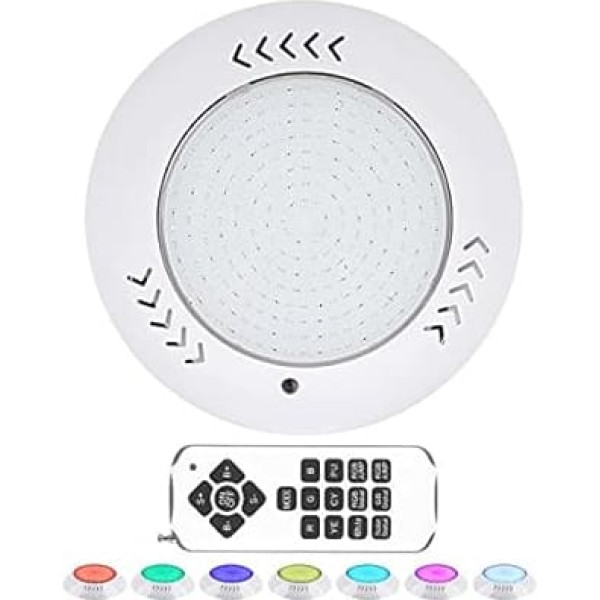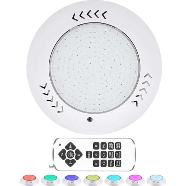 【Multi-color pool spotlight】: LED pool lights are made of 280 LED chips, with higher brightness, more energy saving and a service life of 50,000 hours. The pool light decoration has 16 colour modes, 7 static modes, 5 dynamic modes, 12 brightness adjustment levels and 10 speed adjustment levels. Safe working voltage: designed with 12V AC/DC input, it does not cause harm to people and enjoys a safe swimming pool environment. The LED swimming pool spotlight is filled with resin to make it 100% waterproof. (A 12 V electronic transformer is required for installation, not included in the packaging) 【Memory Mode】: In memory mode, the light effect set at the last turn off and on is maintained. The distance of the remote control in the water is 5 metres. Thanks to the porous design, pool lights can achieve better cooling underwater and effectively extend their service life. Suitable for flat or concave walls, with necessary mounting equipment, easy to install. Widely used: the new graphic design is more concise and widely used in underwater lighting decoration, landscape lighting, garden lighting, horticultural engineering design, public fountain places, public or private swimming pools and other areas. Package includes: 30 W LED swimming pool waterproof IP68, with 200 cm power cable, remote control, mounting screws x 4, swimming pool lighting and English manual for remote control. Please contact us for English instructions › See more product details