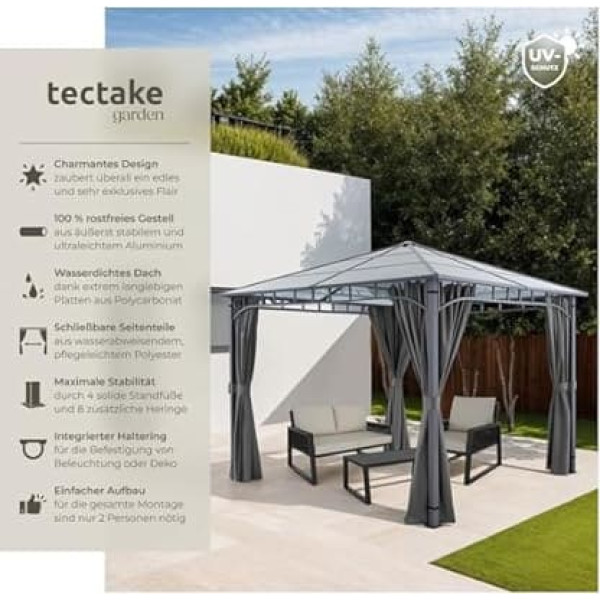 Stylish pavilions: give your garden an exclusive flair with the shelter gazebo from tectake. With its modern design and materials, the patio canopy becomes the centre of your garden. Whether as a barbecue gazebo at the BBQ grill with friends or relaxing outdoor chilling - the large tent offers perfect protection from sun and rain, while creating an elegant atmosphere. Enjoy unforgettable moments in your stylishly furnished outdoor area. Terrace canopy free standing with UV protection: the robust polycarbonate roof panels offer optimal protection against harmful UV radiation and are extremely weatherproof. Whether used as a pergola or patio roof, this gazebo can withstand all weather conditions. The rust-proof aluminium frame with powder coating ensures durability, so that you can enjoy your sun protection garden for many years. Experience the combination of functionality and style in any weather. Flexible side panels: the water-repellent side panels made of easy-care polyester on the metal gazebo can be flexibly adjusted via the smooth-running rail system. Use it as a privacy screen or to protect against wind and weather. Whether as a gazebo party tent or as a sun protection patio canopy – the side panels offer you maximum flexibility. In addition, they are easy to clean so that your shelter always looks like new. Change your outdoor area as you like Firm anchoring for safety: safety comes first – therefore the patio canopy comes with eight sturdy pegs that ensure a firm anchoring of the solid feet. Even in windy conditions, your gazebo remains stable and securely in place. The sophisticated construction and the robust material ensure that you can rely on your gazebo, no matter what the weather. Experience stability and safety in your outdoor area. Integrated eyelet for pavilion lighting: the integrated eyelet in the roof of the gazebo allows you to easily attach lighting or decoration. Whether romantic fairy lights or functional hanging lamps – transform your dome gazebo into your dream arbour easily and according to your wishes and create an inviting atmosphere for social evenings. Thanks to the sturdy construction, you can be sure that your decorations stay firmly in place. › See more product details