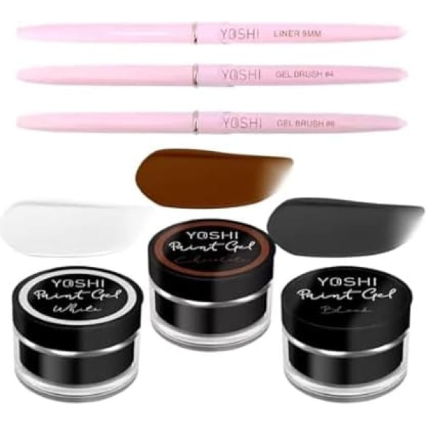 Versatile colour selection - Our set contains highly pigmented colour gels in white, black and chocolate for creative nail designs. Perfect for any mood and occasion. Professional use: with the high-quality gel brushes in different sizes, every detail can be achieved. Ideal for precise gel applications and nail art. Long-lasting results – the colour gels are characterised by exceptional coverage and durability. Enjoy long-lasting, radiant nails. Quality materials - All products are made from carefully selected materials. The brushes offer optimal gel distribution thanks to their nylon and Kolinsky bristles. Perfect gift: This nail art set is the ideal gift for all beauty enthusiasts. Create professional nail designs from the comfort of your own home. › See more product details; Product description Product description Immerse yourself in the world of nail art with our exclusive Yoshi nail art kit that includes everything you need for stunning, professional nail designs. This set includes highly pigmented colour gels in the timeless colours white, black and chocolate that transform your nails into works of art. The gel colours offer excellent coverage and remain for a long time thanks to their high-quality formulation. For precise application and design of your nail art, the set contains professional gel brushes in different sizes. Each brush is specially designed for gel technique, with long synthetic nylon bristles or finest Kolinsky natural bristles for even gel distribution. Whether fine lines, detailed patterns or full-surface applications, these brushes are your best tools for creative nail designs. This set is not only suitable for professional nail salons, but also perfect for home users who want to expand their nail art skills. It is the ideal gift for anyone who values well-groomed and artistically designed nails. Treat yourself or your loved one with this comprehensive nail art kit from Yoshi - for impressive results that attract admiring glances. Safety Warning Generic; Product description Product description Immerse yourself in the world of nail art with our exclusive Yoshi nail art kit that includes everything you need for stunning, professional nail designs. This set includes highly pigmented colour gels in the timeless colours white, black and chocolate that transform your nails into works of art. The gel colours offer excellent coverage and remain for a long time thanks to their high-quality formulation. For precise application and design of your nail art, the set contains professional gel brushes in different sizes. Each brush is specially designed for gel technique, with long synthetic nylon bristles or finest Kolinsky natural bristles for even gel distribution. Whether fine lines, detailed patterns or full-surface applications, these brushes are your best tools for creative nail designs. This set is not only suitable for professional nail salons, but also perfect for home users who want to expand their nail art skills. It is the ideal gift for anyone who values well-groomed and artistically designed nails. Treat yourself or your loved one with this comprehensive nail art kit from Yoshi - for impressive results that attract admiring glances. Safety Warning Generic; Product description Immerse yourself in the world of nail art with our exclusive Yoshi nail art kit that includes everything you need for stunning, professional nail designs. This set includes highly pigmented colour gels in the timeless colours white, black and chocolate that transform your nails into works of art. The gel colours offer excellent coverage and remain for a long time thanks to their high-quality formulation. For precise application and design of your nail art, the set contains professional gel brushes in different sizes. Each brush is specially designed for gel technique, with long synthetic nylon bristles or finest Kolinsky natural bristles for even gel distribution. Whether fine lines, detailed patterns or full-surface applications, these brushes are your best tools for creative nail designs. This set is not only suitable for professional nail salons, but also perfect for home users who want to expand their nail art skills. It is the ideal gift for anyone who values well-groomed and artistically designed nails. Treat yourself or your loved one with this comprehensive nail art kit from Yoshi - for impressive results that attract admiring glances. Safety Warning Generic