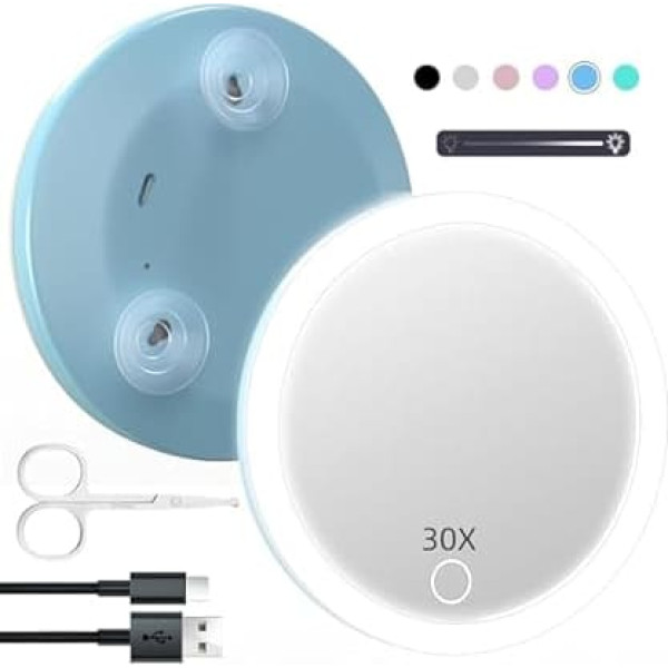 【30X Magnification】This 30x magnification mirror with lights is extremely powerful, making it ideal for focusing on specific parts of your face or eyes in detail. You need to stay about 2-3 inches closer to the mirror to get a clear view. For people with blurred vision or people over 40 years old. If you have never tried a 10x or 20x magnifying mirror, you may not be used to this 30x mirror. Please note this before purchasing. 【Magnifying Mirror with Light】The 30X magnifying mirror with light has 3 suction cups, compact mirror size: 4 x 4 inches; weight:0.1 kg can be stored in a handbag, bag or cosmetic bag. It is especially good as a makeup magnifying mirror with high magnification to make detailed makeup more accurate. 800 mAh rechargeable battery: this compact 30x travel magnifying mirror comes with a USB cable, which is approx. 2 hours to fully charge. A full charge can take about a week. Our LED magnifying mirror with 30x magnification can also be conveniently charged by the adapter, power bank or laptop. Don't worry about replacing the battery. Dimmable 30X Mirror with Light:The lighted makeup mirror with 30x magnification is easy to adjust. Soft LED ring light simulates daylight and helps you create flawless makeup. Our travel makeup mirror with 30x magnification is made of high quality ABS plastic and real glass. Simple design can meet your needs for different occasions. PORTABLE TRAVEL COMPANION This lightweight 30X travel mirror with lights and fur scissors is a perfect companion for women/men. The lighted travel makeup magnifying mirror makes it an ideal compact mirror for home or travel, adding a touch of style to your travel essentials. DURABLE GROOMING SCISSORS Made of stainless steel for durability and lasting performance. These premium grooming scissors with curved safety blades and rounded tip for trimming small details. Ideal for removing unwanted facial hair, body hair and eyebrow hair. › See more product details; Product description Powerful Magnifying Mirror with Lights and Fur Scissors Travel Kit Portable Makeup Accessories for You 5x10x20x30x Specifications: Magnification option: 5x, 10x, 20x, 30x. Material: ABS Frame + Glass Measures 4\; Product description Powerful Magnifying Mirror with Lights and Fur Scissors Travel Kit Portable Makeup Accessories for You 5x10x20x30x Specifications: Magnification option: 5x, 10x, 20x, 30x. Material: ABS Frame + Glass Measures 4\; Powerful Magnifying Mirror with Lights and Fur Scissors Travel Kit Portable Makeup Accessories for You 5x10x20x30x Specifications: Magnification option: 5x, 10x, 20x, 30x. Material: ABS Frame + Glass Measures 4\