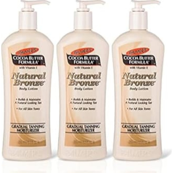 GRADUATED TANNING LOTION Achieve a natural, sun-kissed glow without sun exposure Enriched with Cocoa Butter - Hydrates and deeply nourishes skin for a soft and silky feel Vitamin E - helps improve the appearance of scars, stretch marks and imperfections NATURAL AND EVEN COLOR - Creates and maintains a healthy and natural looking tan Easy to use: streak-free formula for an even finish, suitable for all skin tones › See more product details; Product description Product Description Palmer's The natural bronze body lotion with cocoa butter formula is the perfect solution to achieve a beautiful sun-kissed glow without exposing your skin to harmful UV rays. This luxurious body lotion is enriched with cocoa butter that deeply moisturizes and nourishes your skin, leaving it silky and soft to the touch. Infused with vitamin E, it helps improve the appearance of scars, stretch marks and blemishes and promotes a healthier and more even skin tone. This gradual tanning lotion is designed to build and maintain a natural looking tan, allowing you to achieve the perfect color level to complement your skin tone. The easy to use and streak-free formula ensures an even application every time so you can enjoy a flawless finish. Suitable for all skin types, Palmer's Natural Bronze Body Lotion provides a safe and effective way to enjoy a sun-kissed glow all year round. The practical pack of 3 ensures that you always have your favourite tanning lotion available, whether at home or on the go. Experience the benefits of natural bronze body lotion with Palmer's cocoa butter formula and reveal beautifully tanned and radiant skin. Safety Warning For external use only. Avoid contact with eyes. In case of contact with eyes, rinse thoroughly with water. Discontinue use if irritation or rash occurs. Keep out of reach of children. This product does not contain sun protection and does not protect against sunburn. Repeated unprotected skin exposure during tan can increase the risk of skin aging, skin cancer and other harmful effects on the skin, even if it is not burned.; Product description Product Description Palmer's The natural bronze body lotion with cocoa butter formula is the perfect solution to achieve a beautiful sun-kissed glow without exposing your skin to harmful UV rays. This luxurious body lotion is enriched with cocoa butter that deeply moisturizes and nourishes your skin, leaving it silky and soft to the touch. Infused with vitamin E, it helps improve the appearance of scars, stretch marks and blemishes and promotes a healthier and more even skin tone. This gradual tanning lotion is designed to build and maintain a natural looking tan, allowing you to achieve the perfect color level to complement your skin tone. The easy to use and streak-free formula ensures an even application every time so you can enjoy a flawless finish. Suitable for all skin types, Palmer's Natural Bronze Body Lotion provides a safe and effective way to enjoy a sun-kissed glow all year round. The practical pack of 3 ensures that you always have your favourite tanning lotion available, whether at home or on the go. Experience the benefits of natural bronze body lotion with Palmer's cocoa butter formula and reveal beautifully tanned and radiant skin. Safety Warning For external use only. Avoid contact with eyes. In case of contact with eyes, rinse thoroughly with water. Discontinue use if irritation or rash occurs. Keep out of reach of children. This product does not contain sun protection and does not protect against sunburn. Repeated unprotected skin exposure during tan can increase the risk of skin aging, skin cancer and other harmful effects on the skin, even if it is not burned.; Product Description Palmer's The natural bronze body lotion with cocoa butter formula is the perfect solution to achieve a beautiful sun-kissed glow without exposing your skin to harmful UV rays. This luxurious body lotion is enriched with cocoa butter that deeply moisturizes and nourishes your skin, leaving it silky and soft to the touch. Infused with vitamin E, it helps improve the appearance of scars, stretch marks and blemishes and promotes a healthier and more even skin tone. This gradual tanning lotion is designed to build and maintain a natural looking tan, allowing you to achieve the perfect color level to complement your skin tone. The easy to use and streak-free formula ensures an even application every time so you can enjoy a flawless finish. Suitable for all skin types, Palmer's Natural Bronze Body Lotion provides a safe and effective way to enjoy a sun-kissed glow all year round. The practical pack of 3 ensures that you always have your favourite tanning lotion available, whether at home or on the go. Experience the benefits of natural bronze body lotion with Palmer's cocoa butter formula and reveal beautifully tanned and radiant skin. Safety Warning For external use only. Avoid contact with eyes. In case of contact with eyes, rinse thoroughly with water. Discontinue use if irritation or rash occurs. Keep out of reach of children. This product does not contain sun protection and does not protect against sunburn. Repeated unprotected skin exposure during tan can increase the risk of skin aging, skin cancer and other harmful effects on the skin, even if it is not burned.