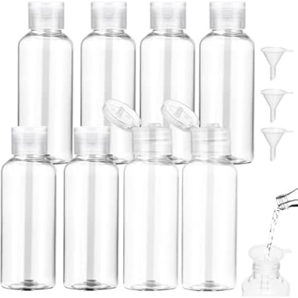 Set of 8 Travel Bottles for Filling, Travel Bottles Set, 100 ml Transparent Liquid Bottles for Filling with 3 Small Funnels, for Shampoo, Shower Gel, Lotion, Cosmetics