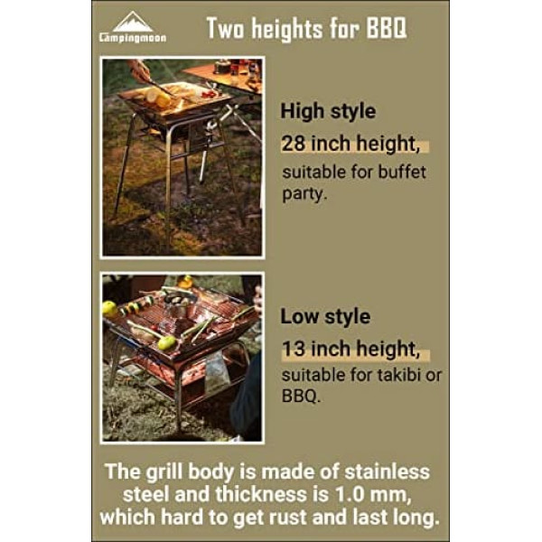 Portable camping grill with high style and low style to use. The tall style has a height of 28 inches, which is suitable for stand buffet parties. Low style has 33cm height which is suitable for takibi or BBQ. This portable campfire charcoal grill features a sturdy 304 stainless steel cooking grate. You can put heavy cooking utensils such as Dutch oven on this camping grill. This portable BBQ grill is recommended for about 4-5 people. All parts can be folded into an attached storage bag and are very easy to assemble. Very convenient for BBQ, camping, beach, RV camping and other outdoor activities. Dimensions: unfolded: 16 x 16 x 28 inches (height) / 41 x 41 x 70 (height) cm; weight: 7.3 kg › See more product details